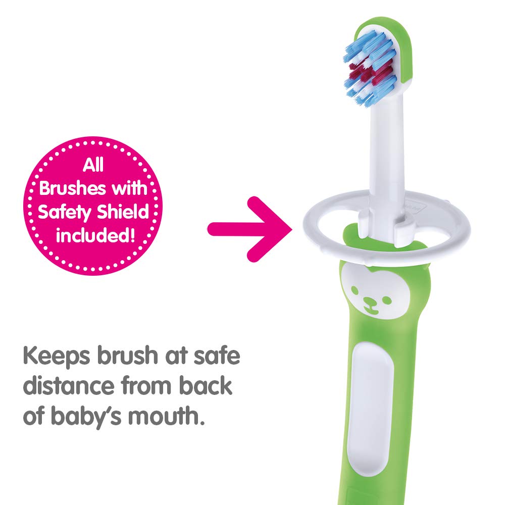 • Sicherheitsschild – Diese Baby-Zahnbürste für Jungen oder Mädchen hat einen Sicherheitsschutz, um die Bürste von der Rückseite des Mundes Ihres Kindes fernzuhalten, wodurch das Risiko des Erstickens vermieden wird.