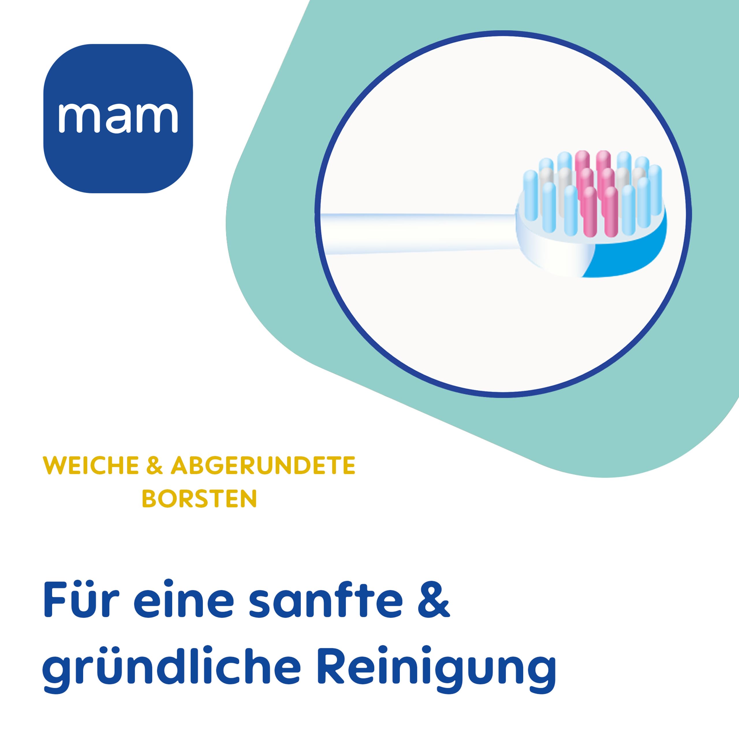 BPA/BPS-freiDie Produktvorteile im Detail:2 x MAM Baby's BrushFür Babys ab 6+ MonateMit kurzem Griff zum einfachen HaltenMit weichen abgerundeten BorstenExtra kleiner BürstenkopfInklusive SicherheitsschildGratis Zahnputz-App