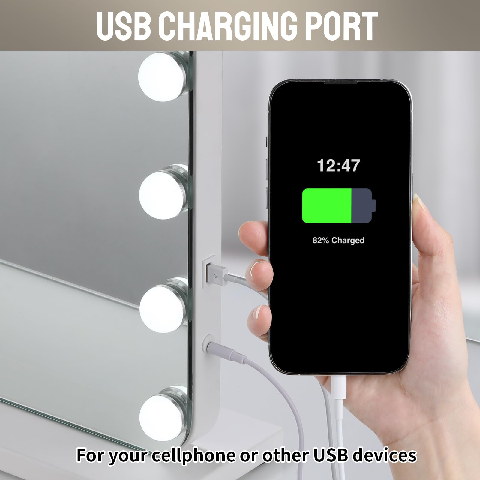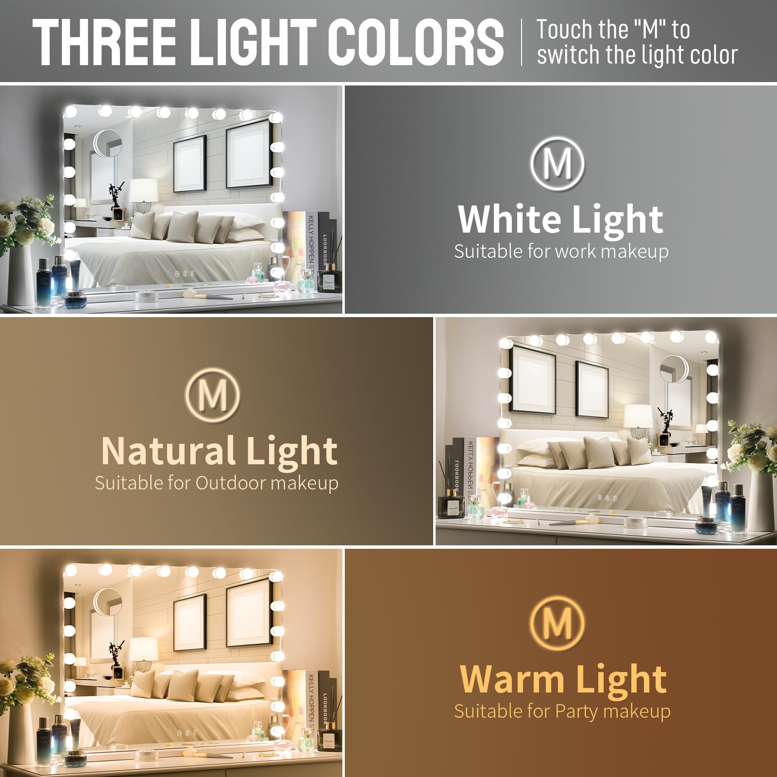 MAMIZO Hollywood Spiegel 80x60 cm, Schminkspiegel mit Beleuchtung, 20 LED, 3 Lichtfarben, Enstellbare Helligkeit, mit USB und 10xLupe, Spiegel mit Licht, Wandspiegel, Tischspiegel