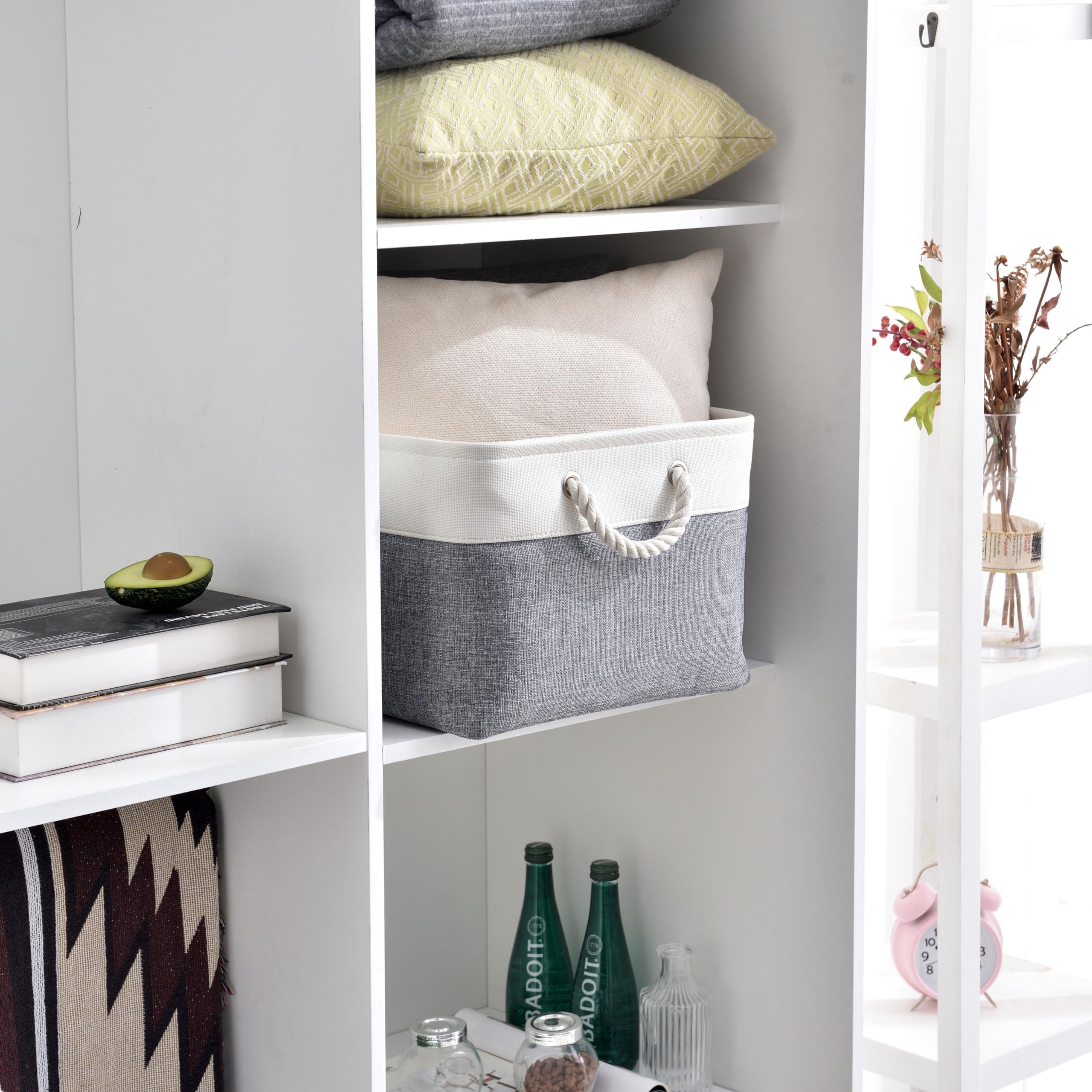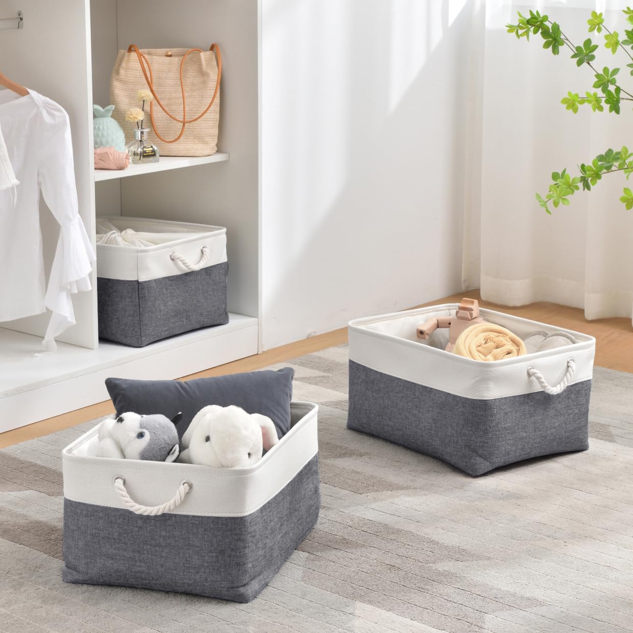 Mangata 3 Stück aufbewahrungskorb Stoff, Faltbare aufbewahrungsbox Schrank, Korb aufbewahrung Stoff mit Baumwolle Seil für Spielzeug, kleiderschrank, Regale, Kleidung (kaltes graues Weiss, gross)