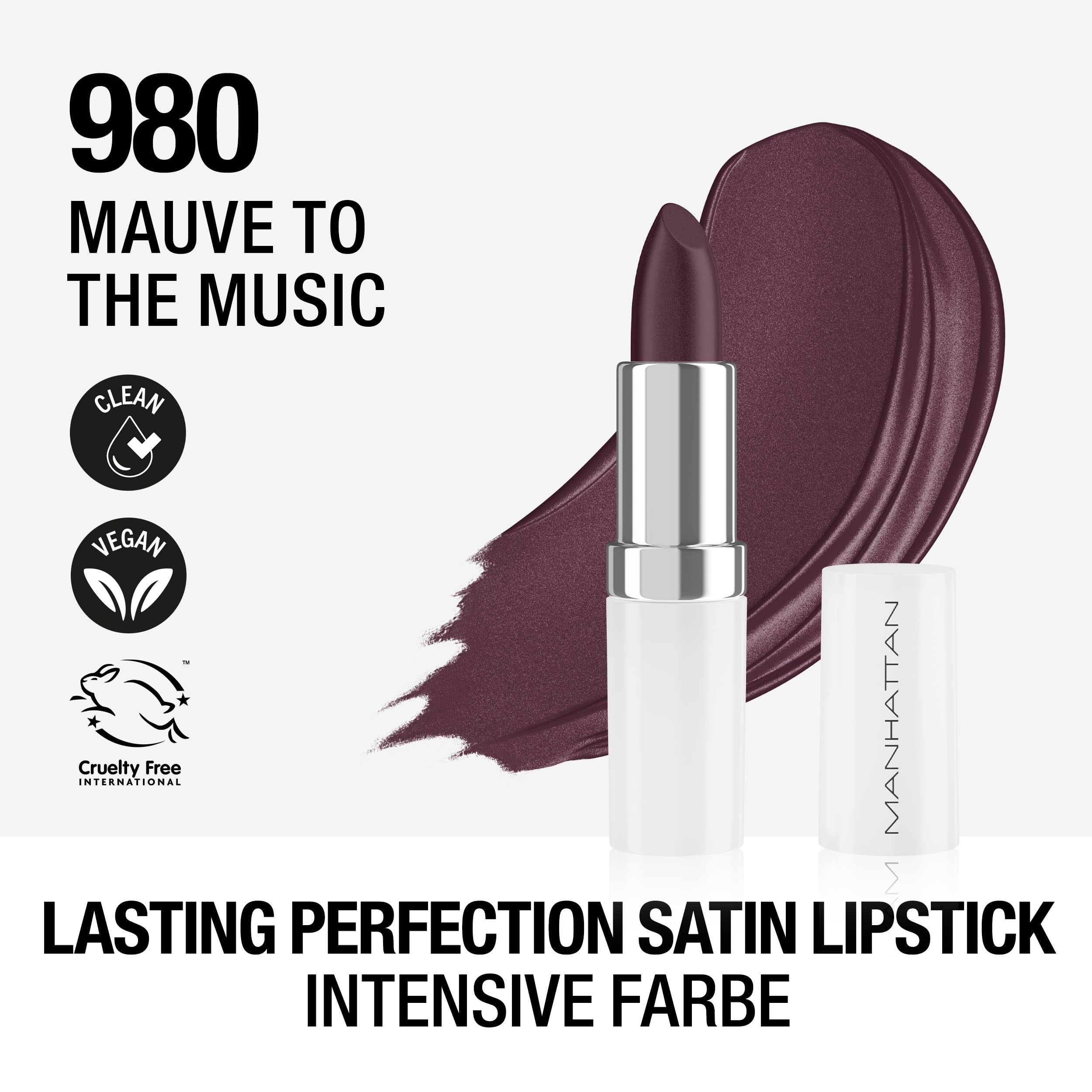 Manhattan Lasting Perfection Satin Lipstick 980 Mauve To The Music, Lippenstift für intensive, langanhaltende Farbe und feuchtigkeitsspendende Pflege