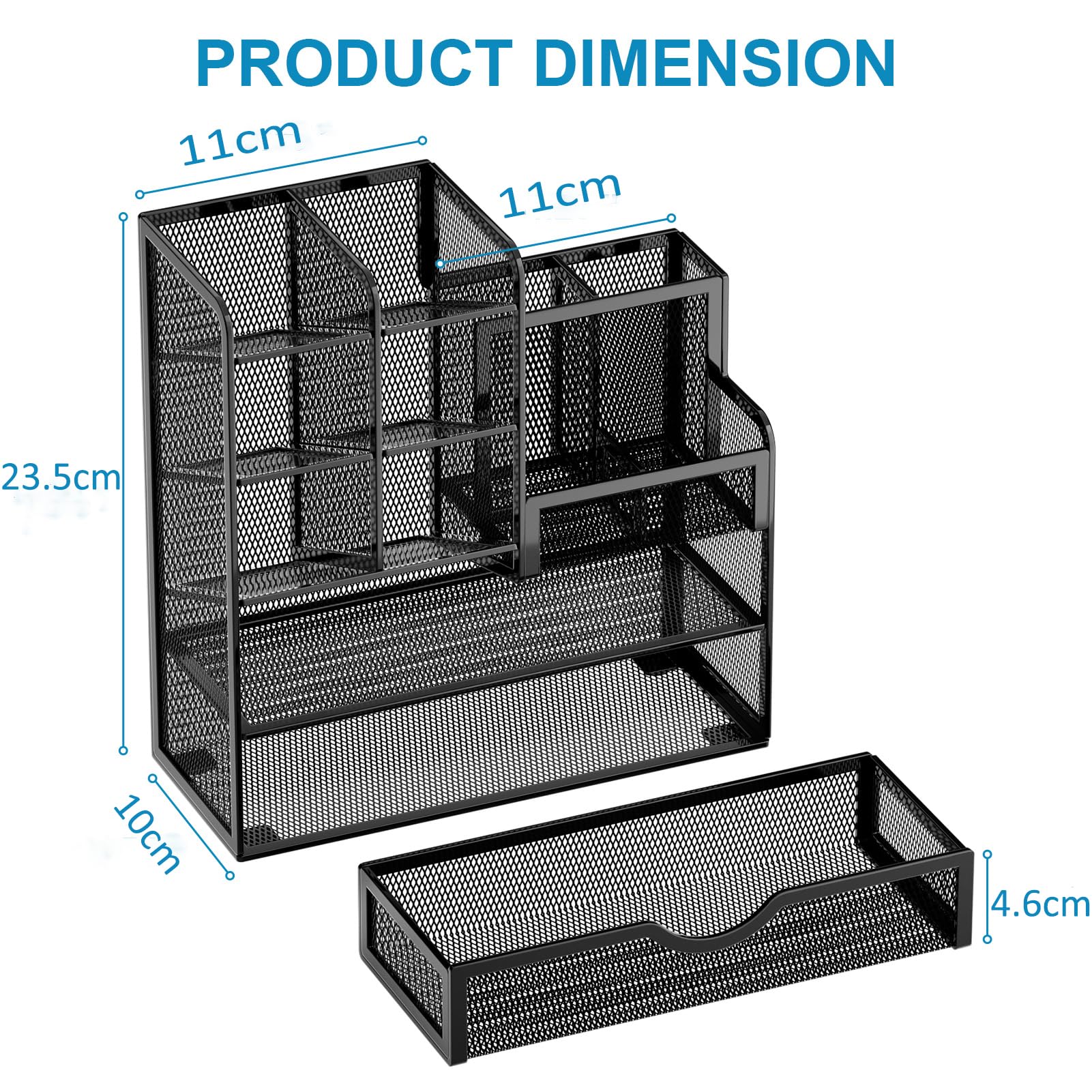 【ENOUGH CAPACITY】: Dieses Schreibtisch-Organizer-Set besteht aus 6 kippbaren Fächern, 4 flachen Bodenfächern, 1 Ablagefach und 1 Schublade, um eine Vielzahl von Gegenständen zu speichern. Multifunktion hilft Ihnen, die Schreibtisch-Gadgets und Schreibwaren ordentlich und ordentlich zu arrangieren.Die beste und sicherste Aufbewahrungsoption für Sie. Perfekte Grösse: 26*23*10 cm.【STABIL UND LANGLEBIG】: Die Schreibtischablage ist aus hochwertigem Metallgewebe gefertigt und mit rutschfesten Füssen ausgestattet, um sie unglaublich stabil zu machen, die nicht leicht rosten und so den Stifthalter die ganze Zeit brandneu halten werden. Die extrem glatten Kanten werden Ihr Eigentum oder Sie selbst nicht verletzen. für alle Ihre Anforderungen zu Hause und im Büro verwenden. 【BEST CHOICE】Der All-in-One-Schreibtisch-Stiftorganisator wird unseren Kunden mehr Komfort im Büro bringen und in unserem täglichen Leben beliebt sein.
