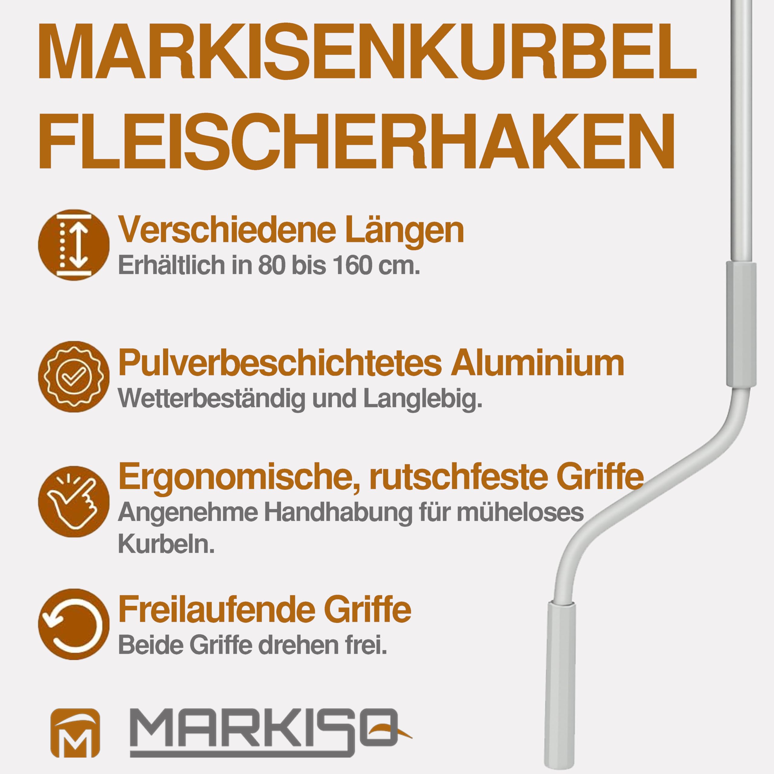 markiso Markisenkurbel 160 cm Grau – Kurbel für Markise mit Fleischerhaken – Kurbelgestänge Pulverbeschichtet, Rostfrei, Ergonomische Griffe, Freilaufend für Leichte Bedienung