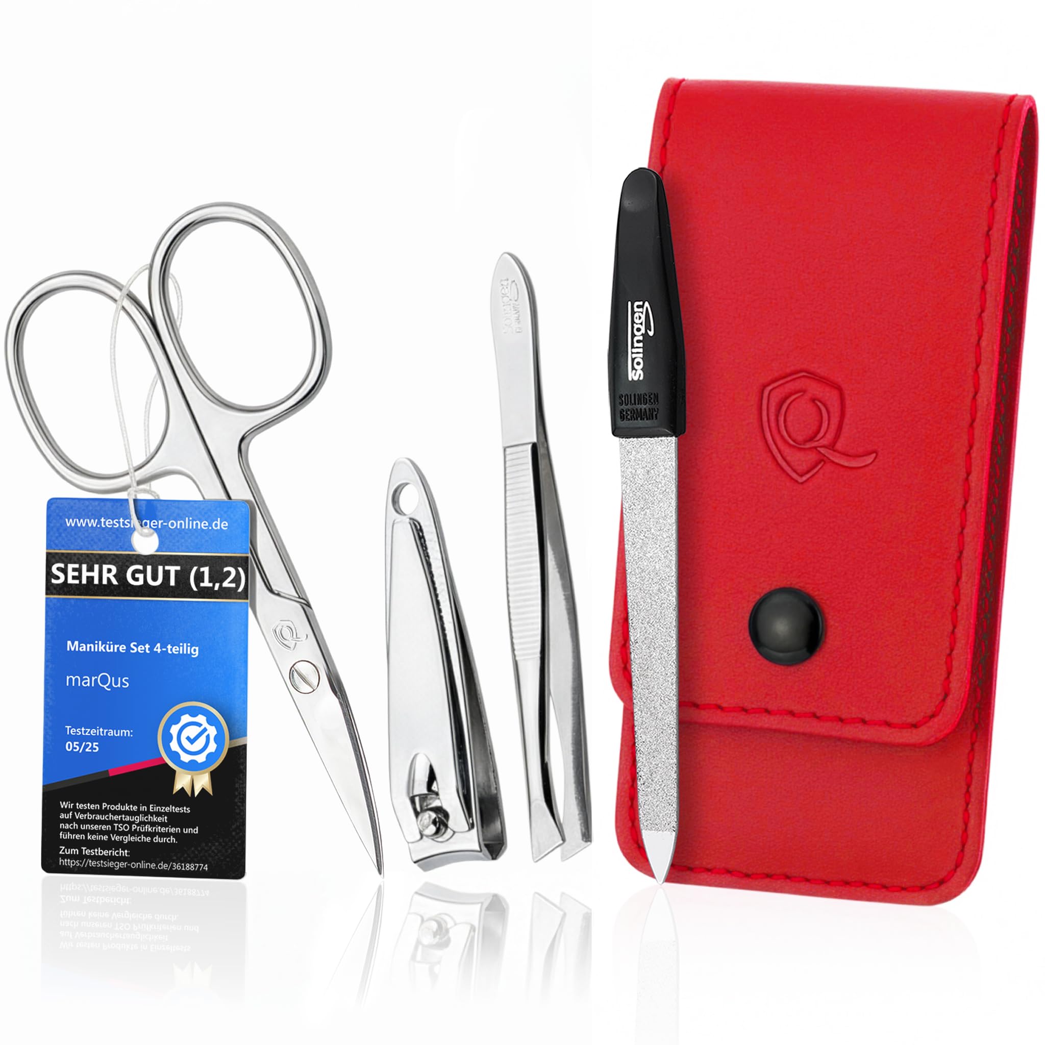 marQus Manikuere Set 4 Teilig – Kompaktes Nagelpflege Set mit Solingen Feile Reiseetui Rot