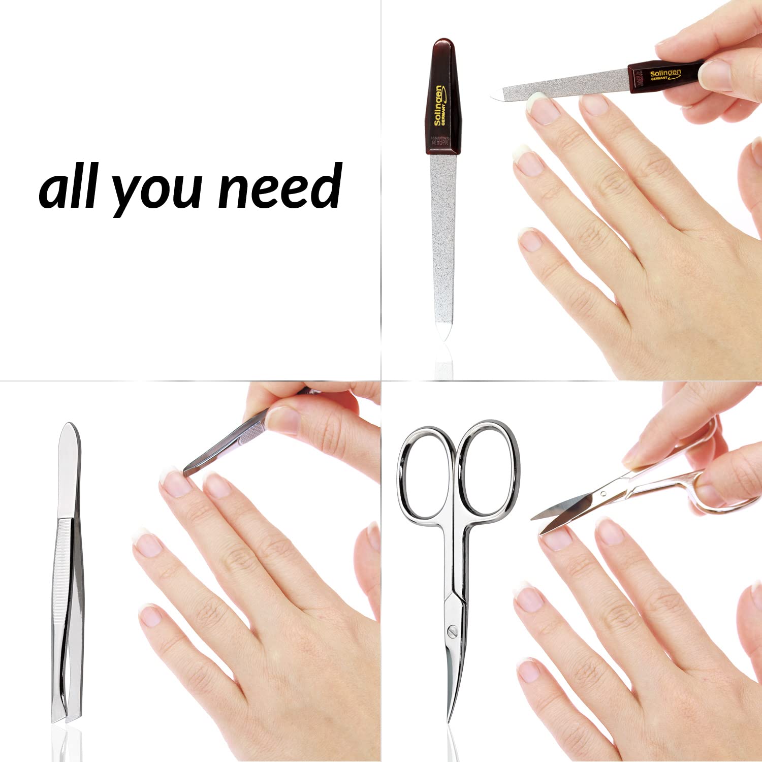 Das Set enthaelt eine praezise verarbeitete Nagelschere, eine Pinzette sowie eine Saphir-Nagelfeile aus Solingen mit grober und feiner Koernung. Die Nagelschere ist handgeschaerft, schnittgeprueft und mit einer verstellbaren Schraube ausgestattet, um eine kontrollierte und saubere Anwendung zu ermoeglichen.