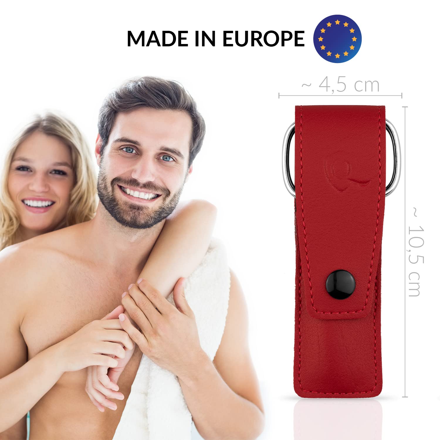 - Etui: echtes Leder (klassisch rot)