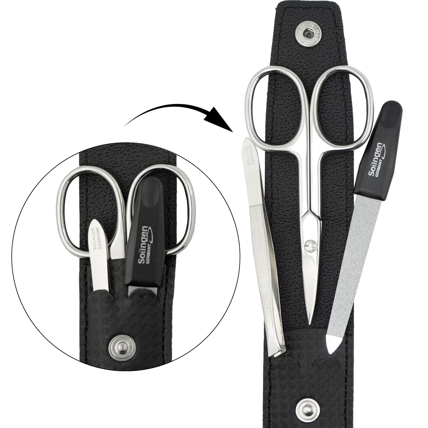 Dieses 3-teilige Manikuere- und Nagelpflegeset ist fuer die schnelle und regelmaessige Pflege von Finger- und Fussnaegeln konzipiert. Das Set enthaelt eine Saphir-Nagelfeile sowie eine Nagelschere und eine Pinzette aus Solingen und eignet sich fuer den Einsatz zu Hause oder unterwegs.