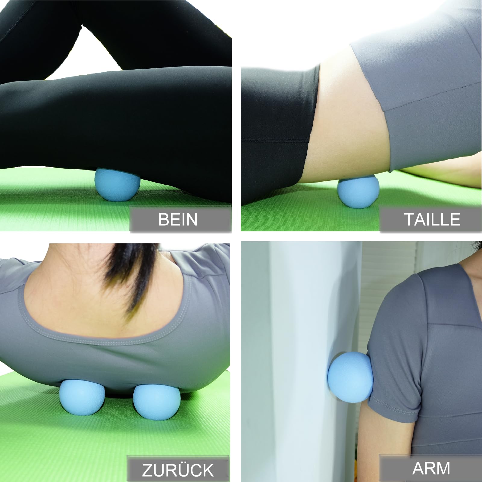 Bälle gezielt auf verspannte Stellen legen oder rollen, leichten bis moderaten Druck ausüben. Nicht direkt auf Knochen oder verletzte Stellen drücken. Bei Schmerzen Anwendung abbrechen.