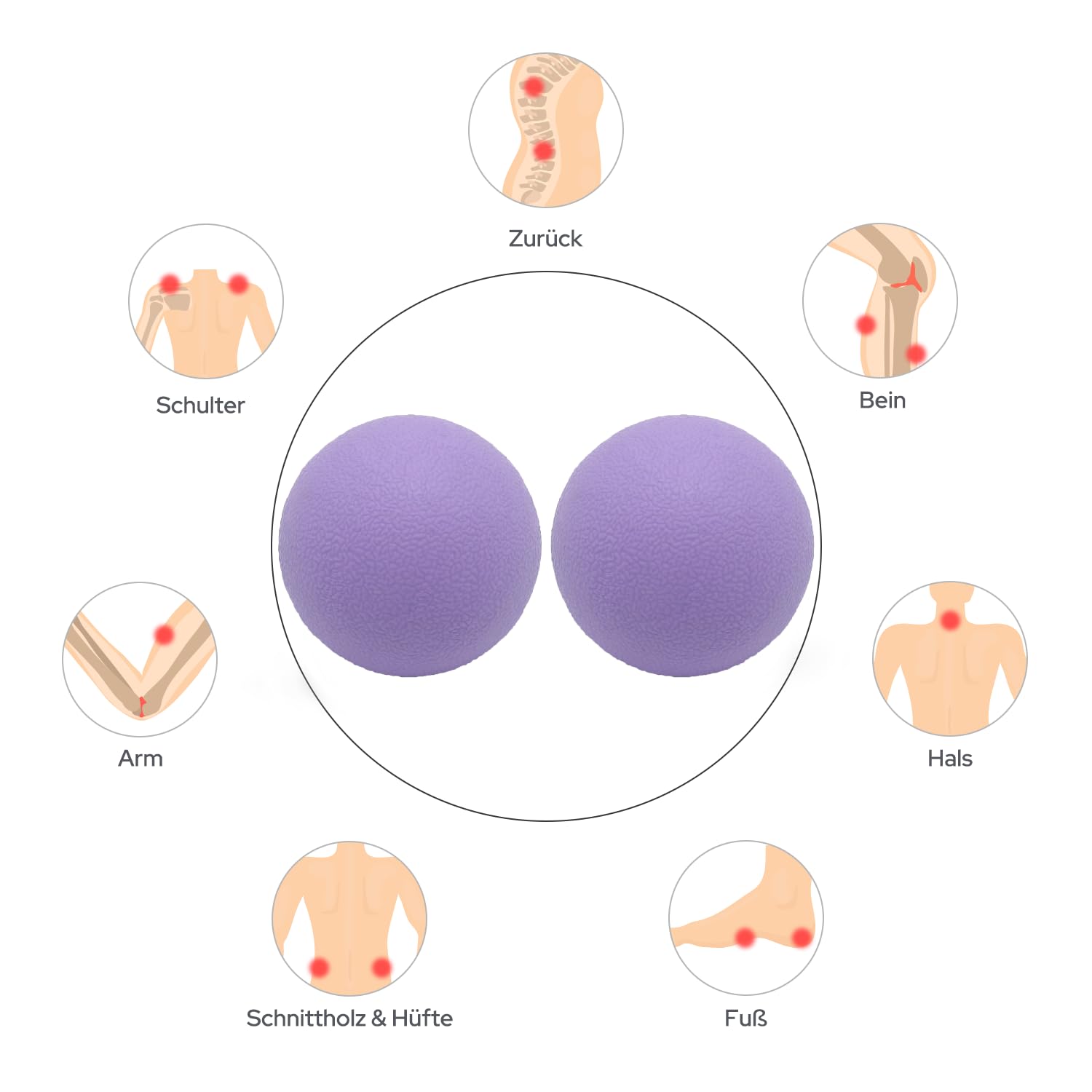 Bälle auf verspannte Stellen legen oder rollen, leichten bis moderaten Druck ausüben. Nicht direkt auf Knochen oder verletzte Stellen anwenden. Bei Schmerzen die Anwendung abbrechen.