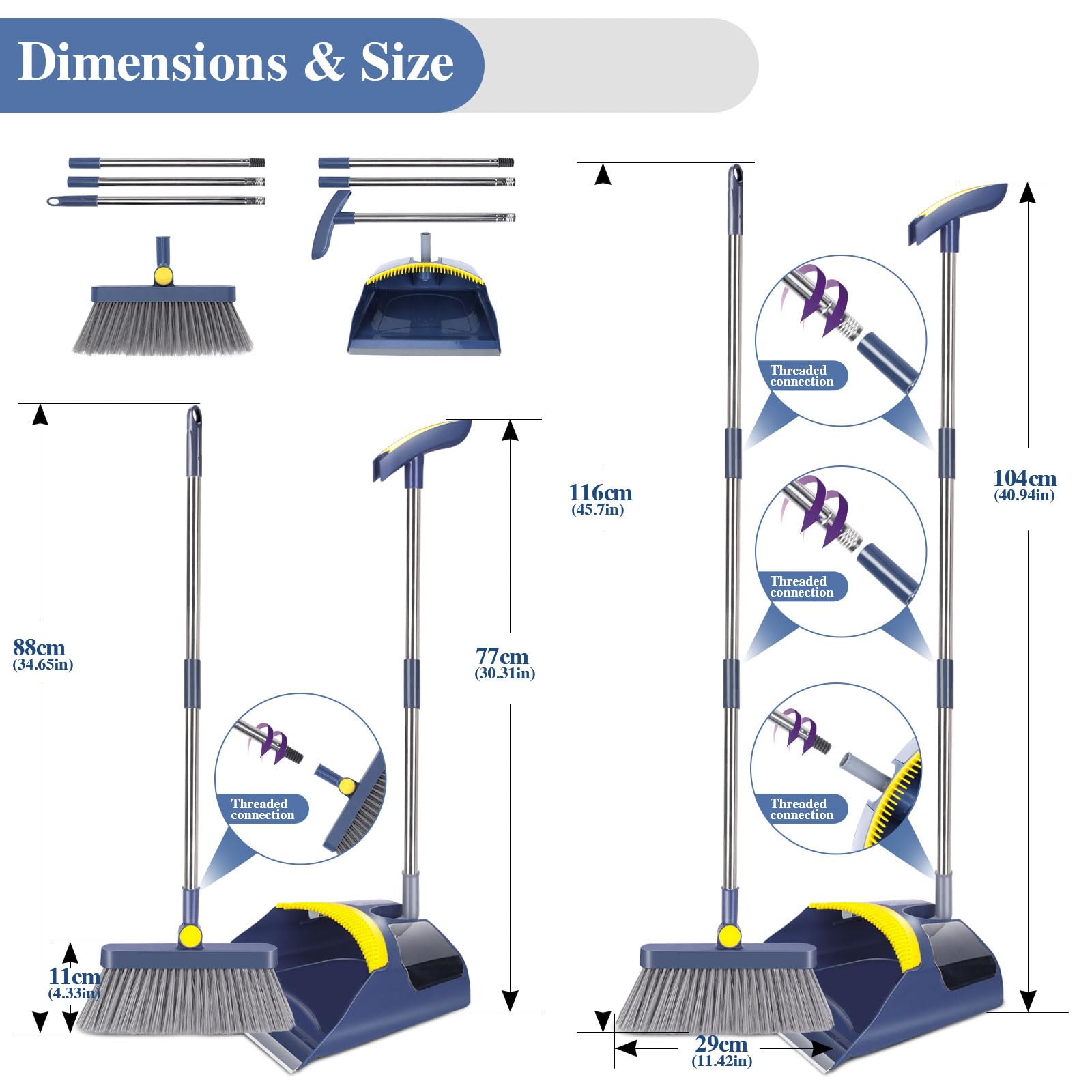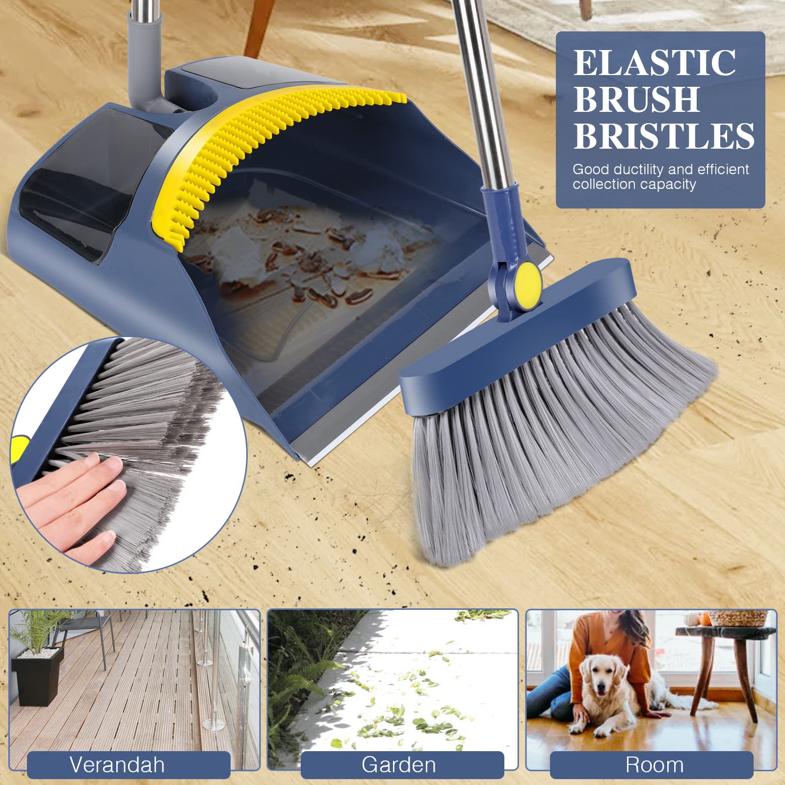 • Verstellbarer Stiel aus Edelstahl:Der Besen ist 121 cm lang, die Kehrschaufel 105 cm lang. Hergestellt aus hochwertigem Edelstahl und ABS. Die Länge kann durch Veränderung der Anzahl der Griffe an Ihre Reinigungsbedürfnisse angepasst werden. Sie können die Häufigkeit des Bückens beim Putzen wirksam reduzieren und Rückenschmerzen vermeiden.