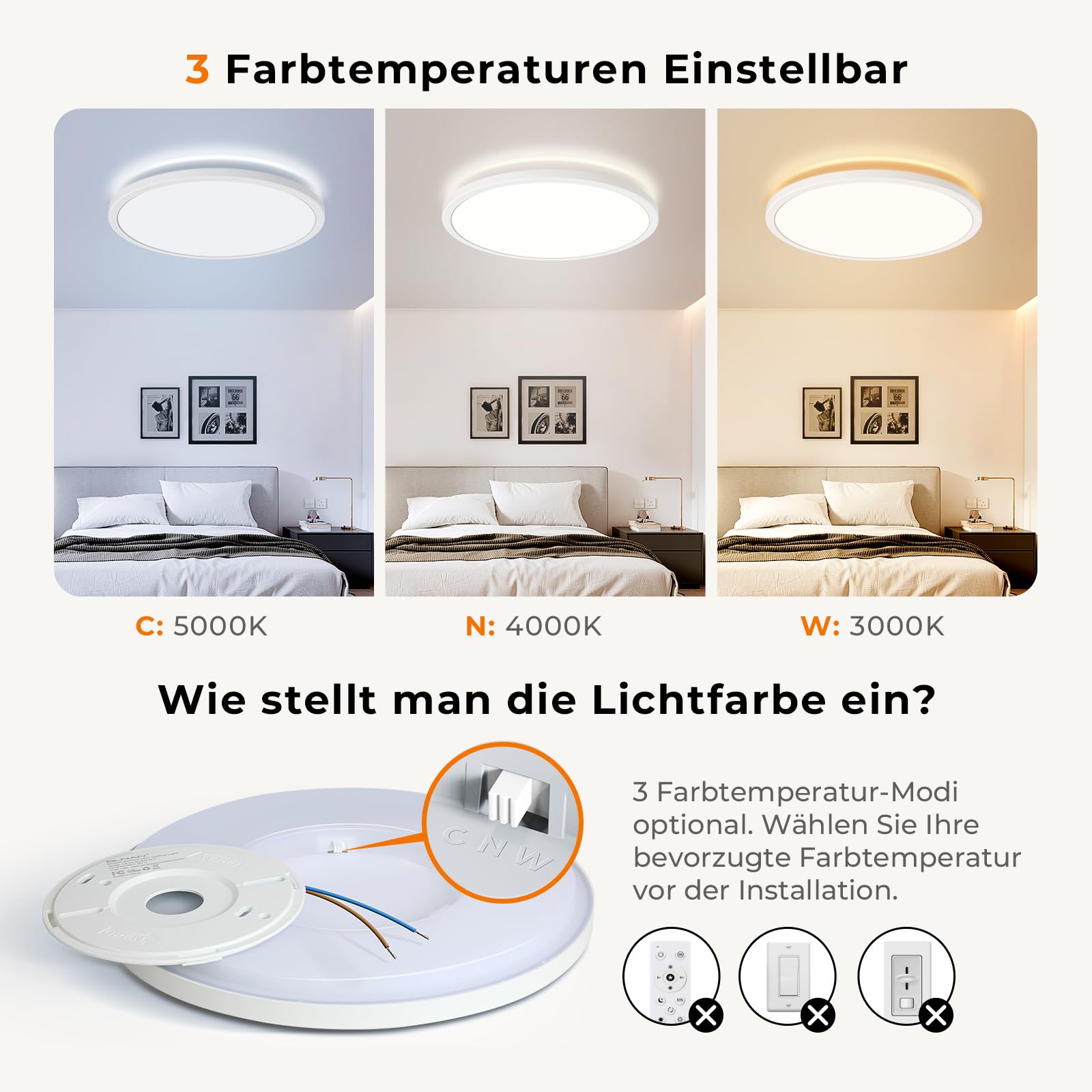 3 stufige Dimmung & 3 Farbtemperaturen ① Innerhalb von 5 Sekunden den Wandschalter kontinuierlich betätigen der Leuchte stufenlos einstellen (10%, 50%, 100%) ② Ausserdem können Sie aus drei verschiedenen Farbtemperaturen wählen (warmweiss 3000K / neutralweiss 4000K / kaltweiss 5000K), indem Sie einfach den Schalter auf der Rückseite der Leuchte betätigen. Diese Deckenleuchte ist ideal für Räume von 5-12㎡ geeignet und bietet für jeden Anlass das passende Licht.