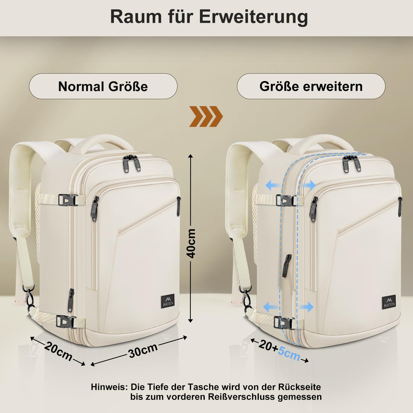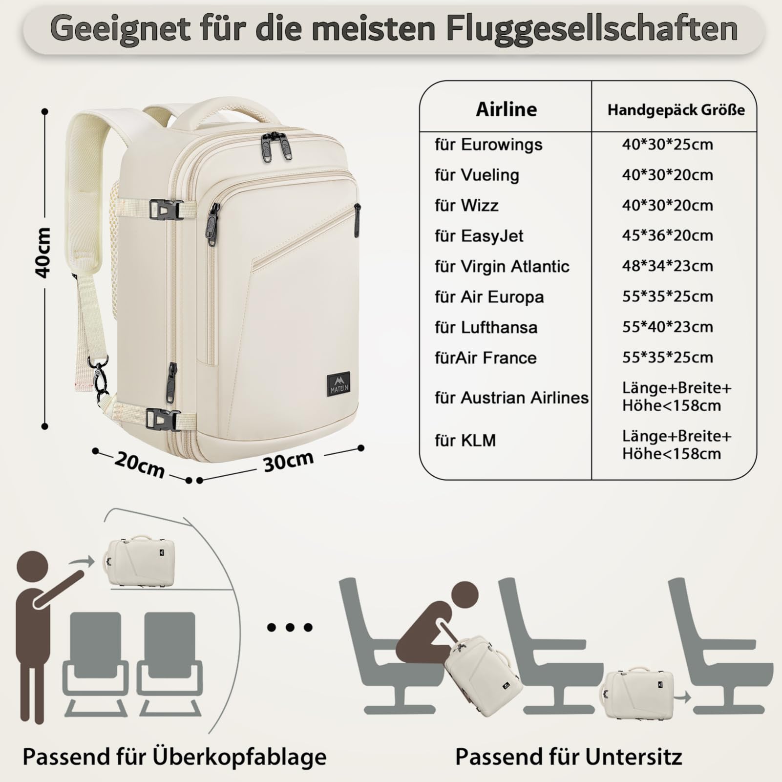 MATEIN 40x30x20 Handgepäck Damen, Handgepäck Rucksack Reisetasche Medium Business Arbeit Frauen Expandable Wasserabweisend Lightweight Cabin Bag, Beige