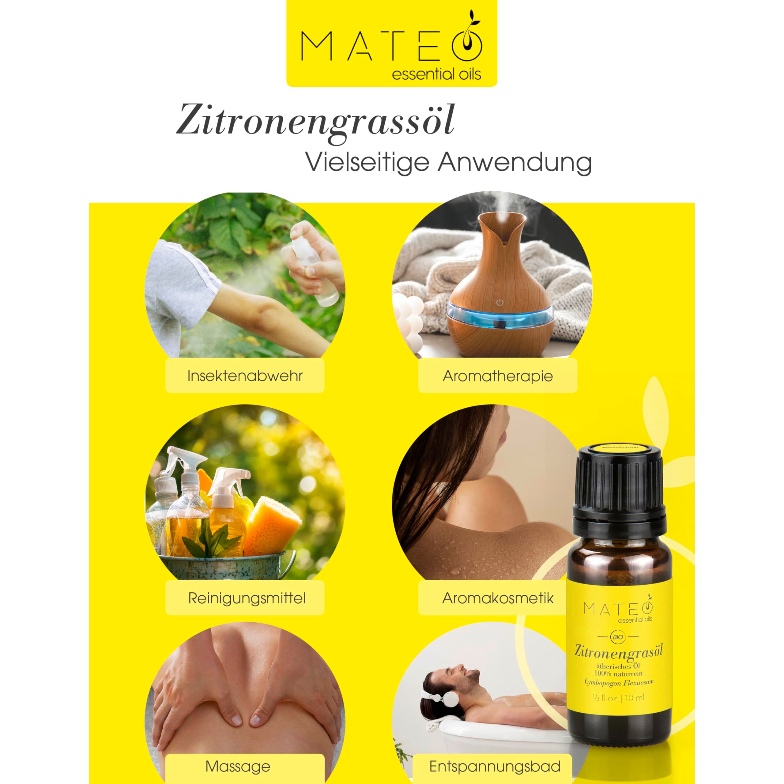 MateoEssentialsOils - 100% Reines und natürlich Zitronengrasöl (Lemongrasöl) – Natürlich & Belebend – Ideal für Aromatherapie, Diffuser, Massage, DIY-Kosmetik – Zitronengras - 10 ml.