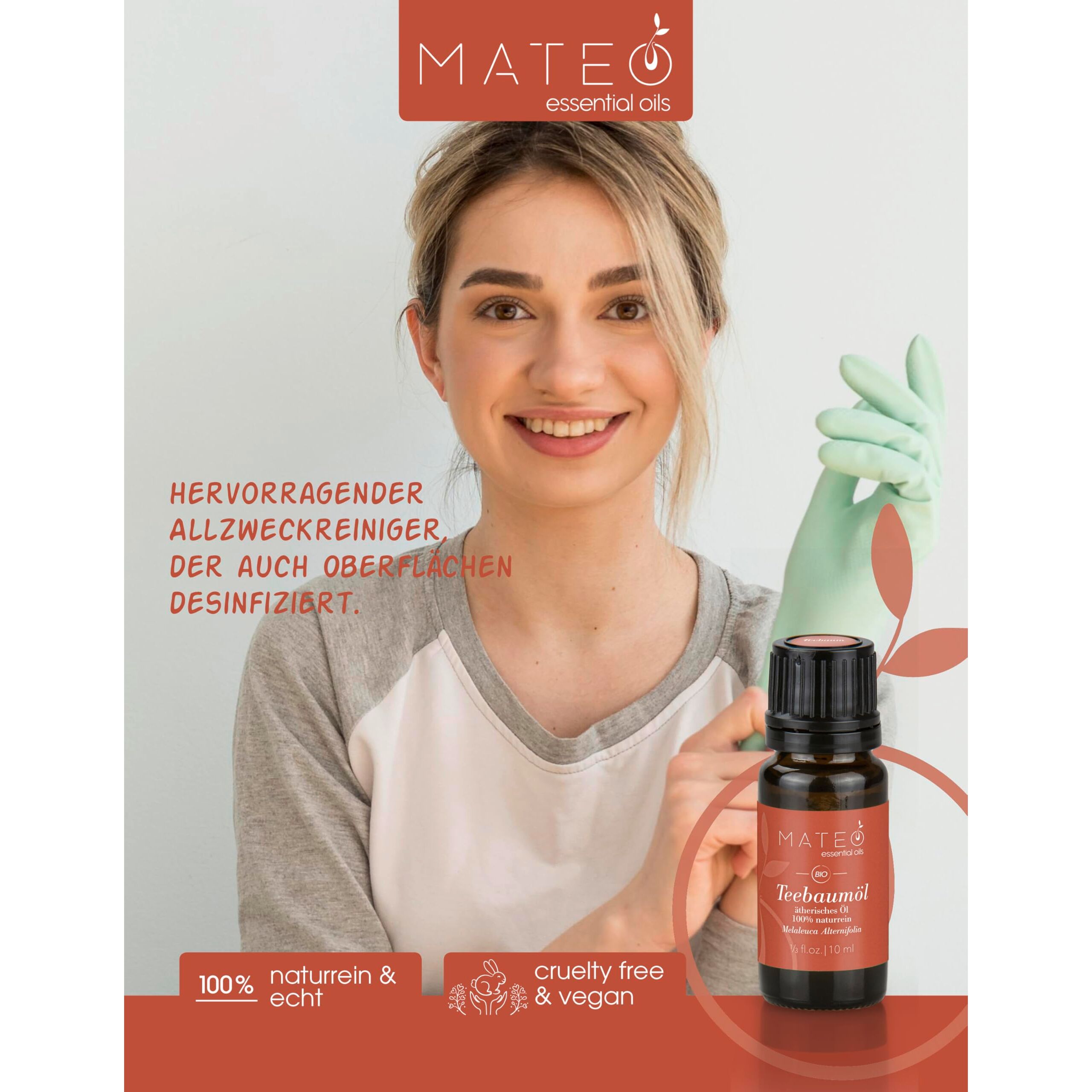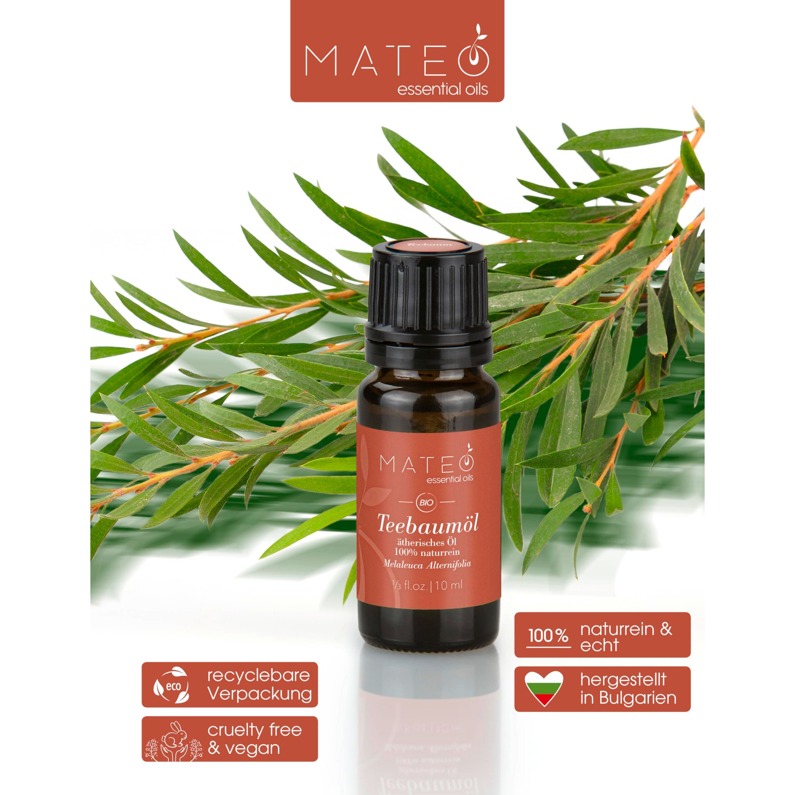 MateoEssentialsOils - 100% Reines und Natürlich Teebaumöl – therapeutische Qualität – Ideal für Aroma Diffuser - Teebaumöl für Aromatherapie, Insektenabwehr und Reinigend - 10 ml.