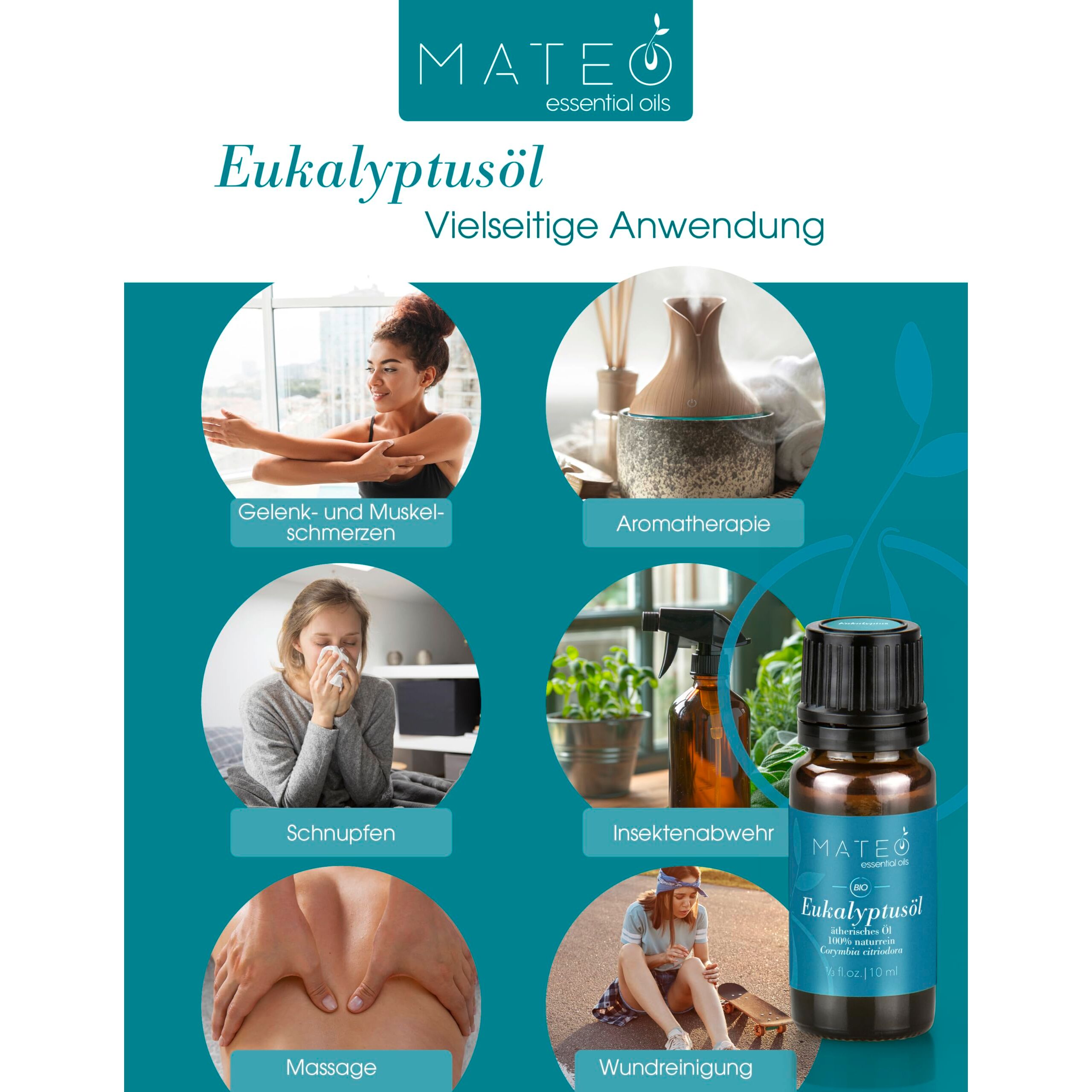 MateoEssentialOils – 100% Reines Eukalyptusöl – Natürlich & Erfrischend – Ideal für Aromatherapie, Raumduft, Hautpflege & Diffuser – Eukalyptus - 10 ml.