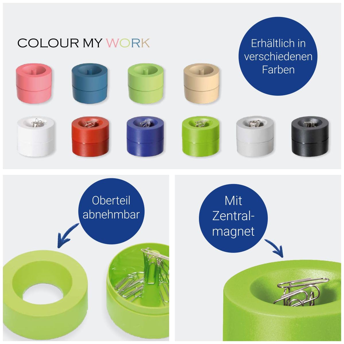 Büroklammern immer griffbereit. Mit Zentralmagnet. Aus bruchsicherem Kunststoff. Grosses Fassungsvermögen: Ø 7,3 cm, Höhe 6 cm.
