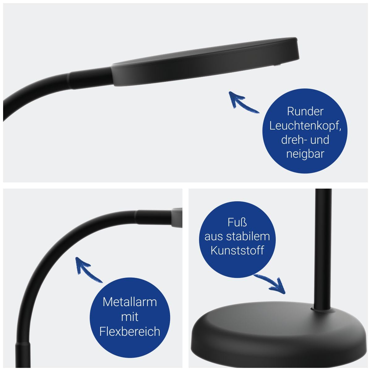 MAUL Schreibtischlampe LED MAULjoy | Kleine Schreibtischlampe mit Standfuss | Moderne Tischlampe für Schreibtisch, Büro | Flexible LED Lampe mit 3000K warmweissem LED Licht | Schwarz