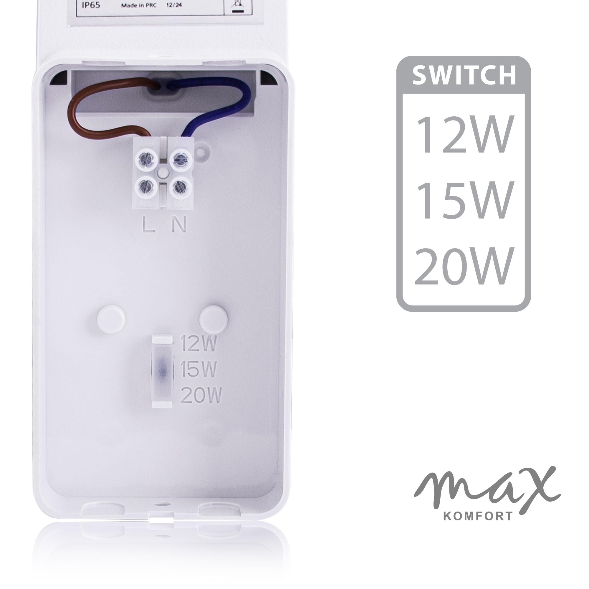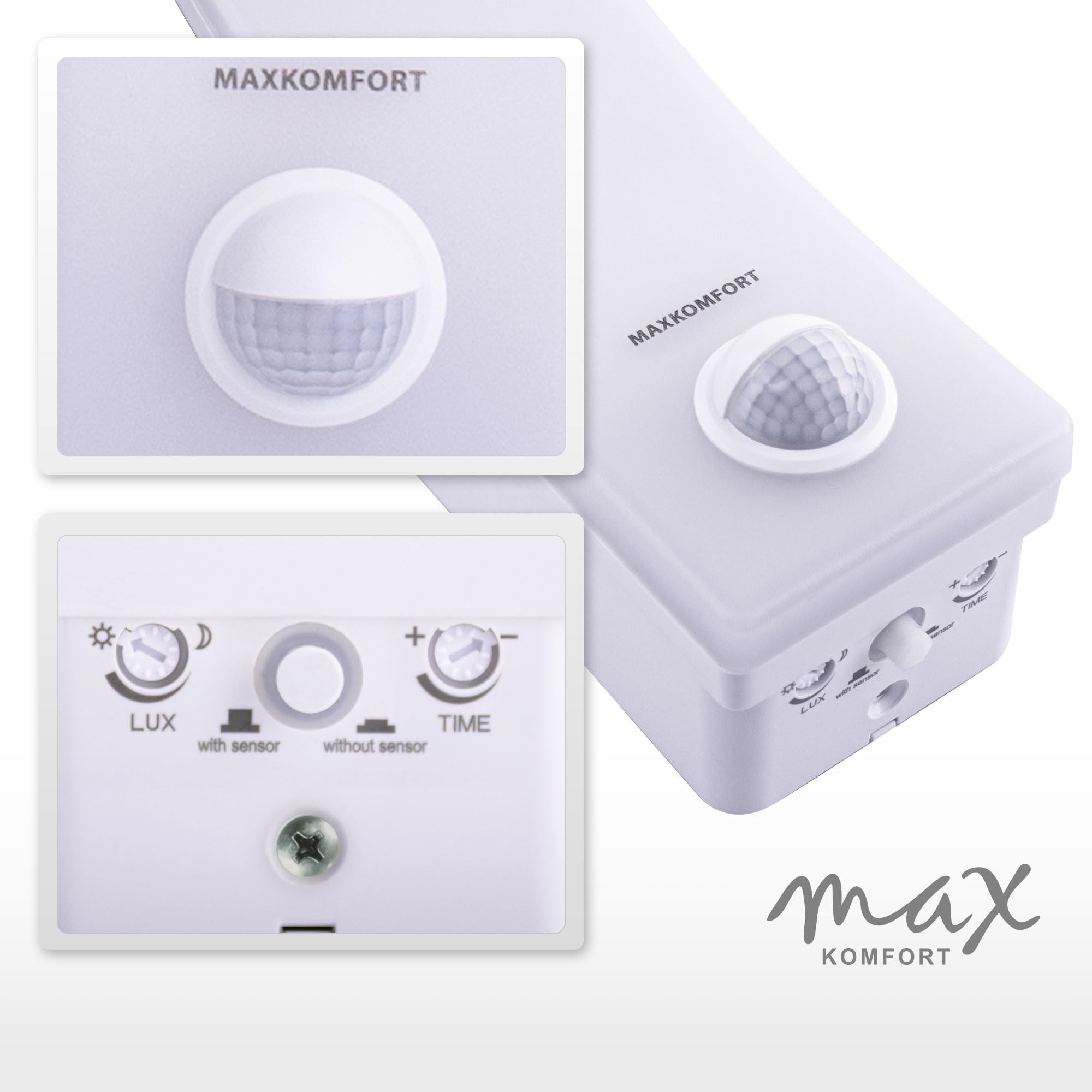 Modell: X-PritAbmessungen: ca. 66 × 250 × 188 mmMaterial: KunststoffFarbe: WeissSchutzart: IP65Abstrahlwinkel: ca. 120°Betriebsspannung: 230V~ 50/60HzLichtfarbe: 4000K (neutralweiss)Lichtstärke: 1600lm, 2000lm, 2500lmLeistung: 12W, 15W, 20W (wählbar)Lebensdauer: 50.000 hSchaltzyklen: 50.000xZünd-/Anlaufzeit: <1 SekundeDimmbar: NeinBewegungsmelder: 140° Erfassungswinkel, max. 9 m ReichweiteLeuchtdauer: 10 Sekunden bis 5 Minuten (einstellbar)LUX-Sensor: 3 bis 2000 Lux (einstellbar)Sensor abschaltbar: Ja (Dauerlicht möglich)Energieeffizienzklasse: EBringen Sie mehr Komfort, Sicherheit und Stil an Ihre Fassade – mit MAXKOMFORT.
