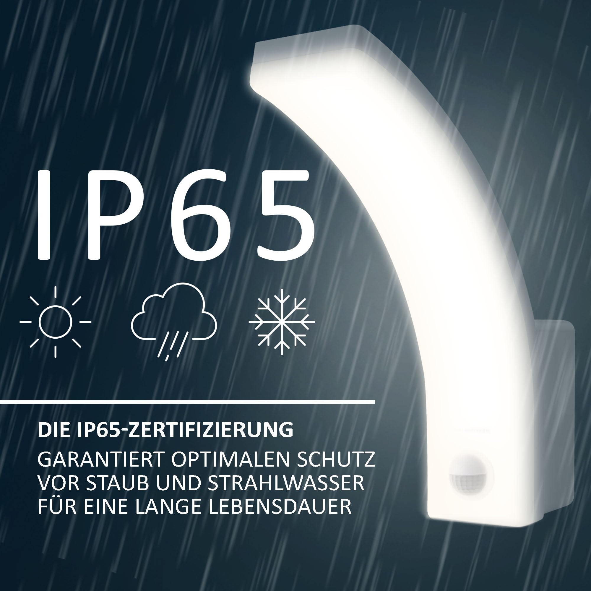 Bewegungsmelder mit Präzision – 140° Erfassungswinkel, bis zu 9 m Reichweite, Leuchtdauer einstellbar (10 Sek. bis 5 Min.), LUX-Sensor von 3–2000 LuxSensor abschaltbar – für den Wechsel zwischen Automatik- und Dauerlicht bei Bedarf3 Helligkeitsstufen – per Schalter wählbar: 12W / 15W / 20W mit bis zu 2500 LumenIP65 wetterfest – ideal für den ganzjährigen AusseneinsatzSofort hell – Neutralweisses Licht (4000K) mit <1 Sek. EinschaltzeitTechnische Daten: