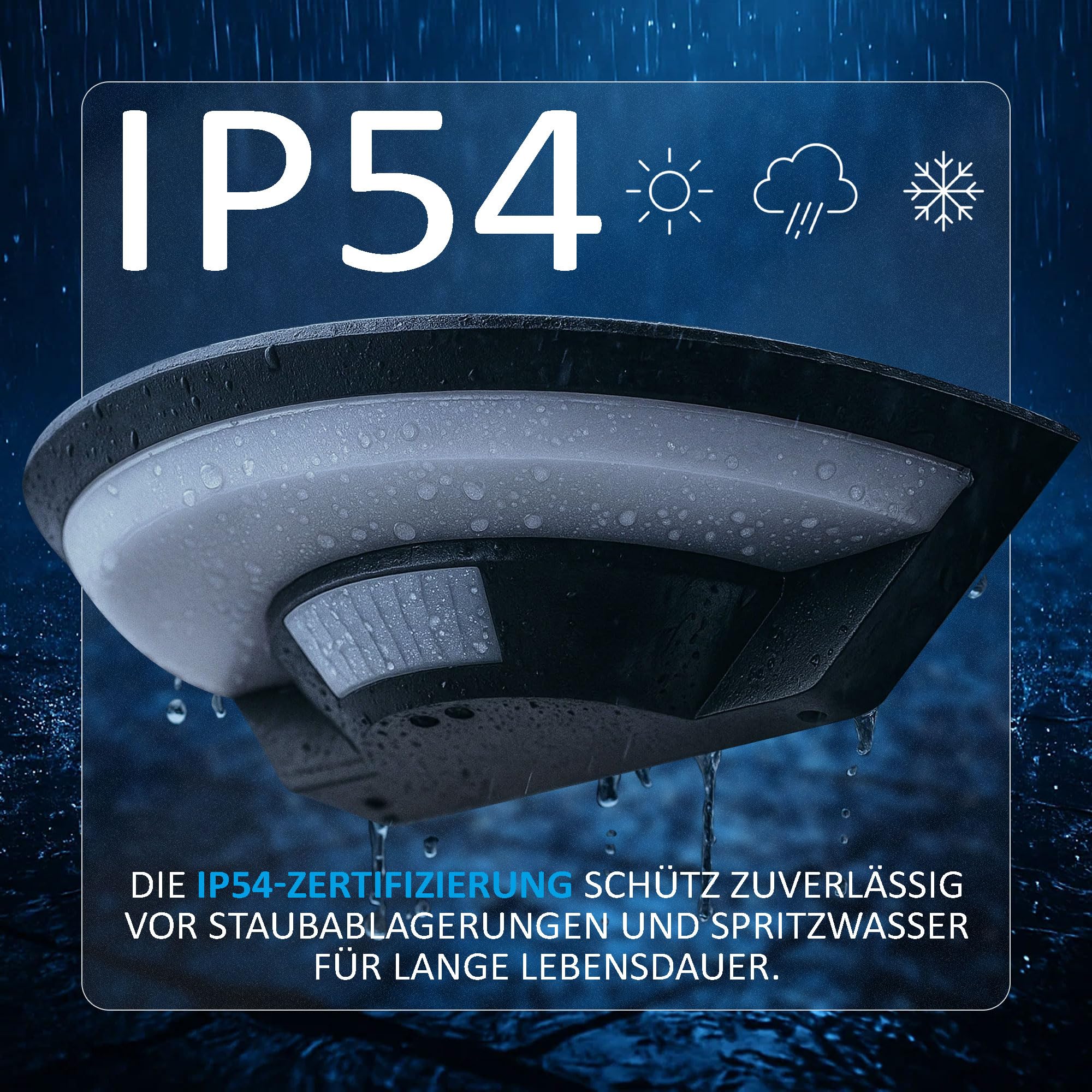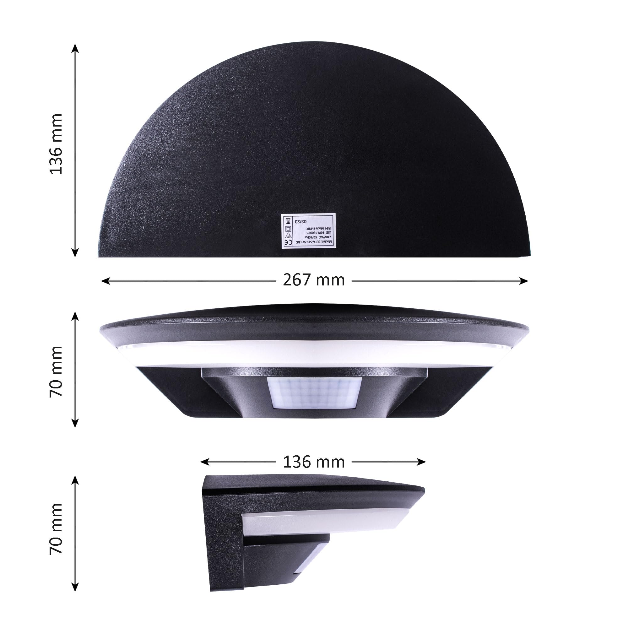Ihre Vorteile auf einen Blick:Modernes, schwarzes Design – schlank und unauffällig10W LED Leistung mit 800 Lumen Helligkeit, neutralweiss (4000K)Integrierter Bewegungsmelder – 120° ErfassungswinkelZeit- und Dämmerungseinstellungen individuell anpassbarWitterungsbeständig (IP54) – ideal für AussenbereicheLange Lebensdauer: 50.000 Std. / 100.000 SchaltzyklenKein Leuchtmittelwechsel nötig – LEDs fest integriertTechnische Details:Abmessungen: ca. 27 x 7 x 13,5 cmMaterial: KunststoffFarbe: SchwarzSchutzart: IP54Betriebsspannung: 230V 50/60HzLeistungsaufnahme: 10 WattLichtstrom: 800 LumenFarbtemperatur: 4000K (Neutralweiss)Abstrahlwinkel: 120°Anlaufzeit/Zündzeit: <1 sDimmbar: NEINBewegungsmelder: 120° Erfassungswinkel, Zeit- & DämmerungseinstellungPerfekt für Eingangsbereiche, Gärten und Terrassen – stilvoll, effizient und zuverlässig!