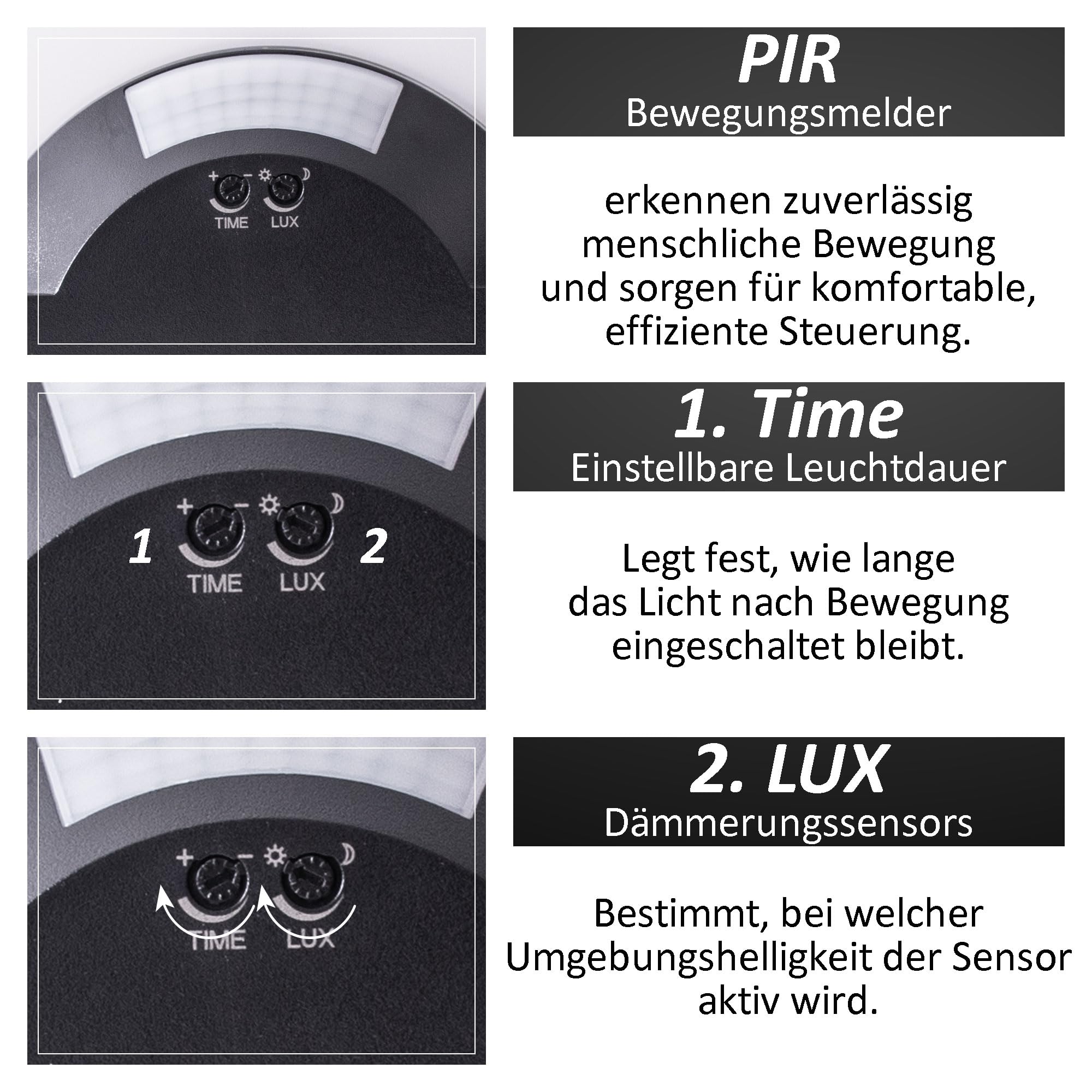 Die SETA LED Aussenleuchte kombiniert schlankes, modernes Design mit leistungsstarker LED-Technik. Dank integriertem Bewegungsmelder mit 120° Erfassungswinkel und einstellbarer Zeit- sowie Dämmerungssensorik erhalten Sie Licht genau dann, wenn es gebraucht wird – energieeffizient und zuverlässig.