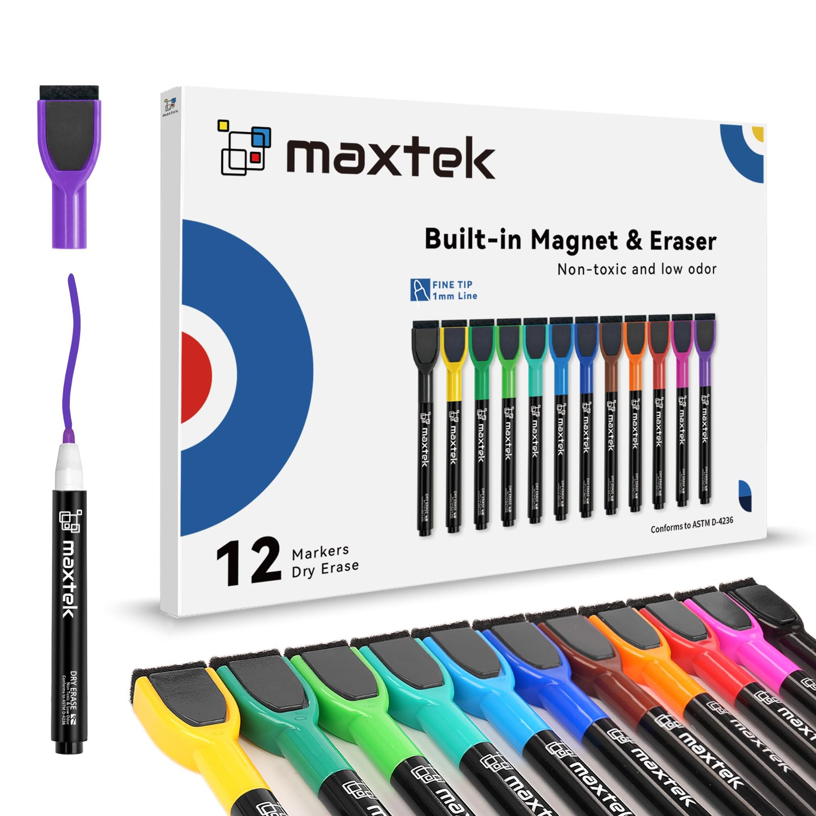 maxtek Whiteboard Stifte, 12 Stück Magnetische, Trocken Abwischbare Marker, Whiteboard Marker mit Feiner Spitze, Folienstift Abwischbar Geruchsarmer Erase Marker mit Radiergummi