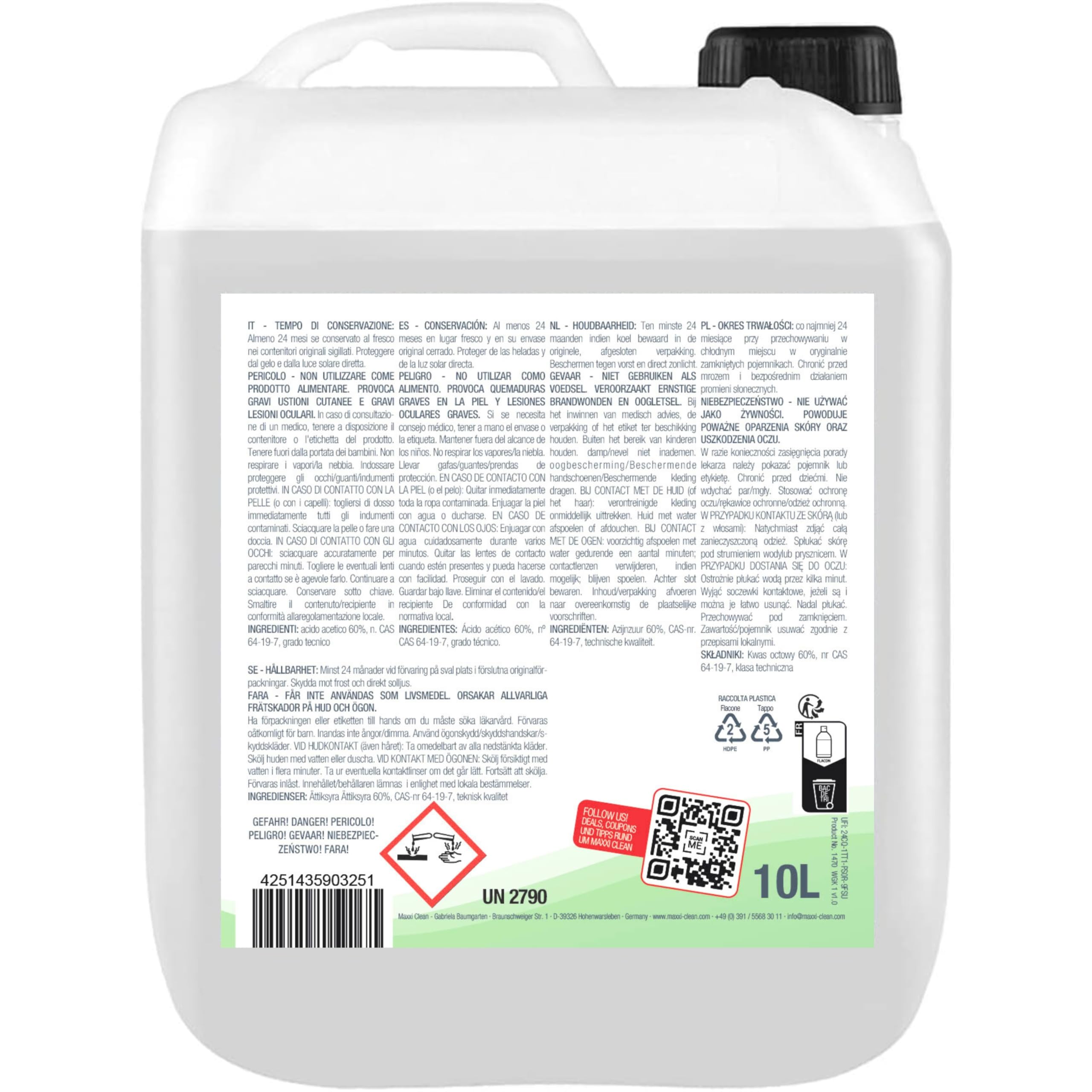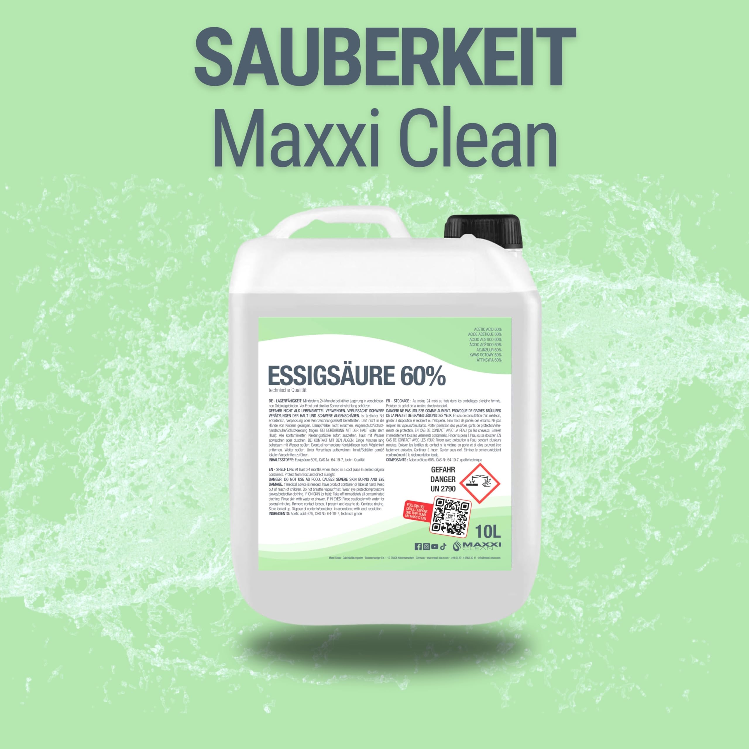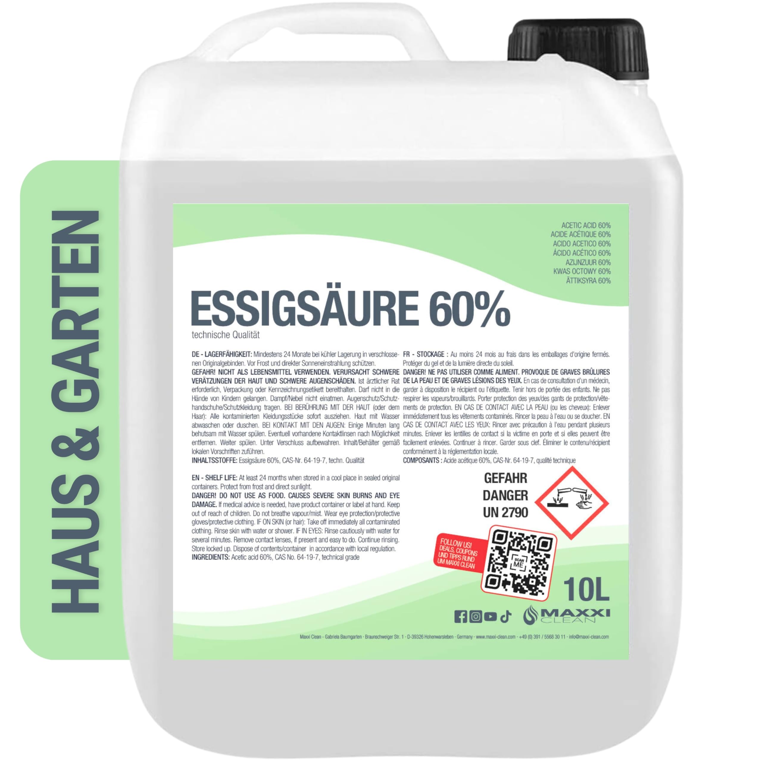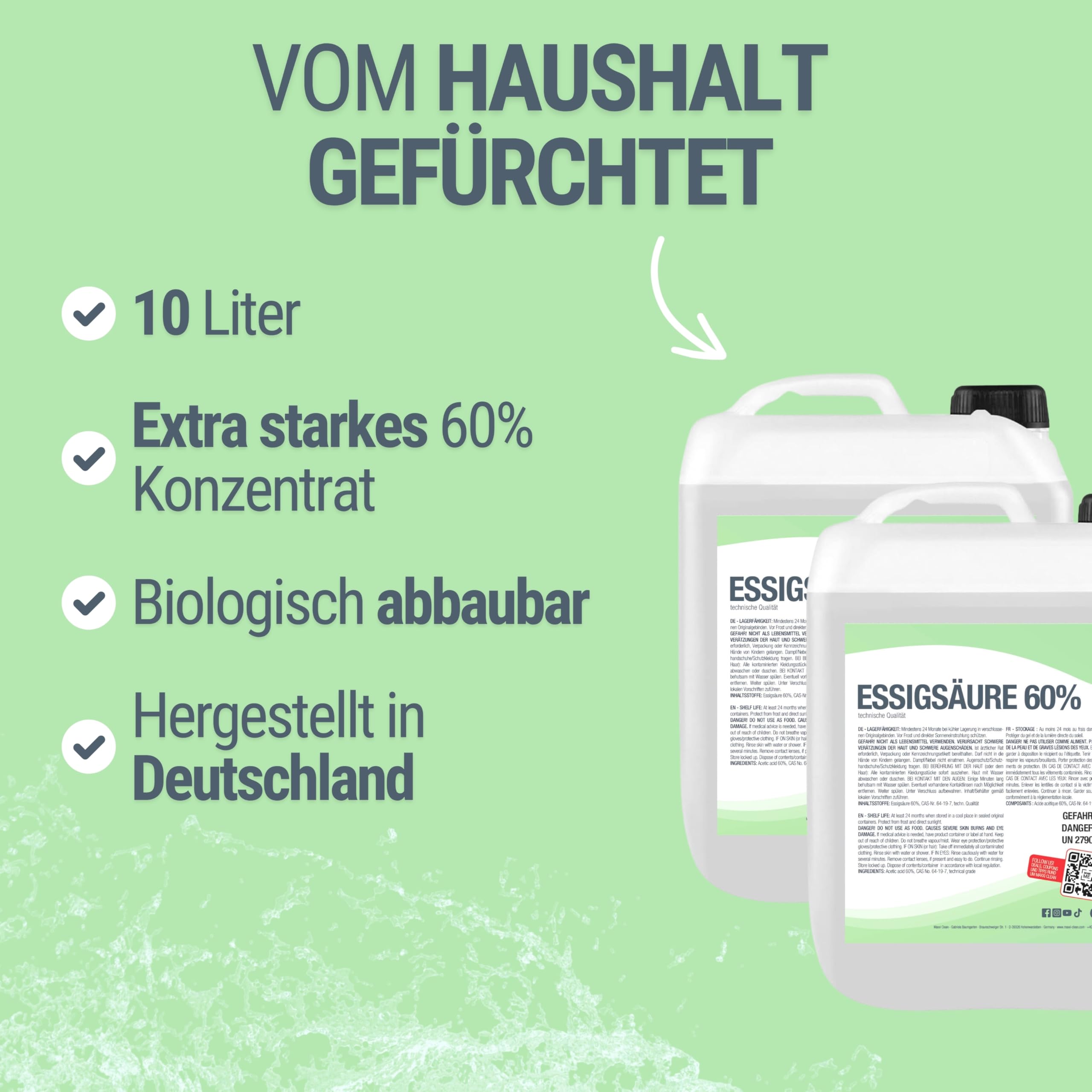 MAXXI CLEAN | 10 l Essigsäure 60% | Ideal als Reiniger und Entkalker | Für Haus und Garten | Essigessenz in Premium Qualität – Made in Germany