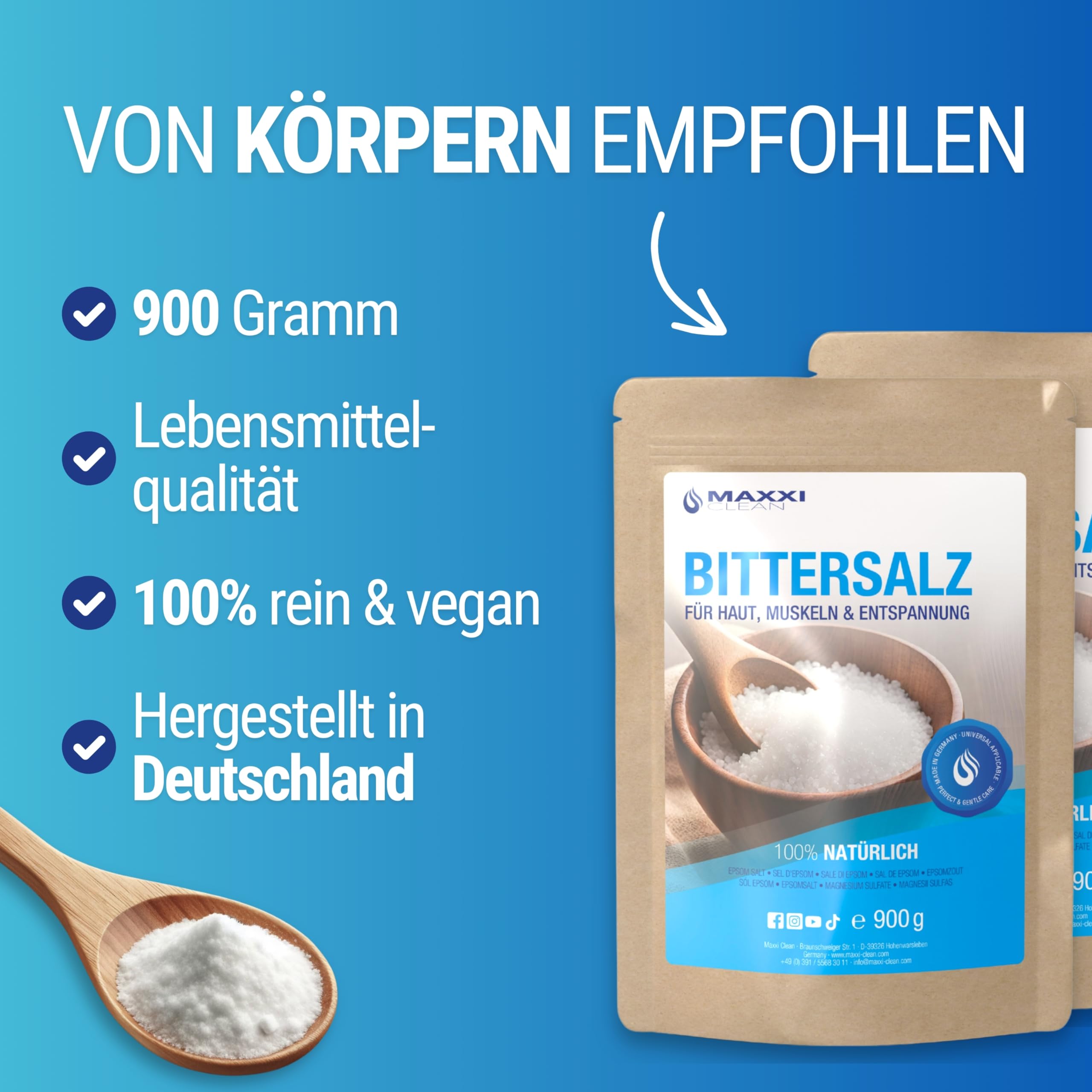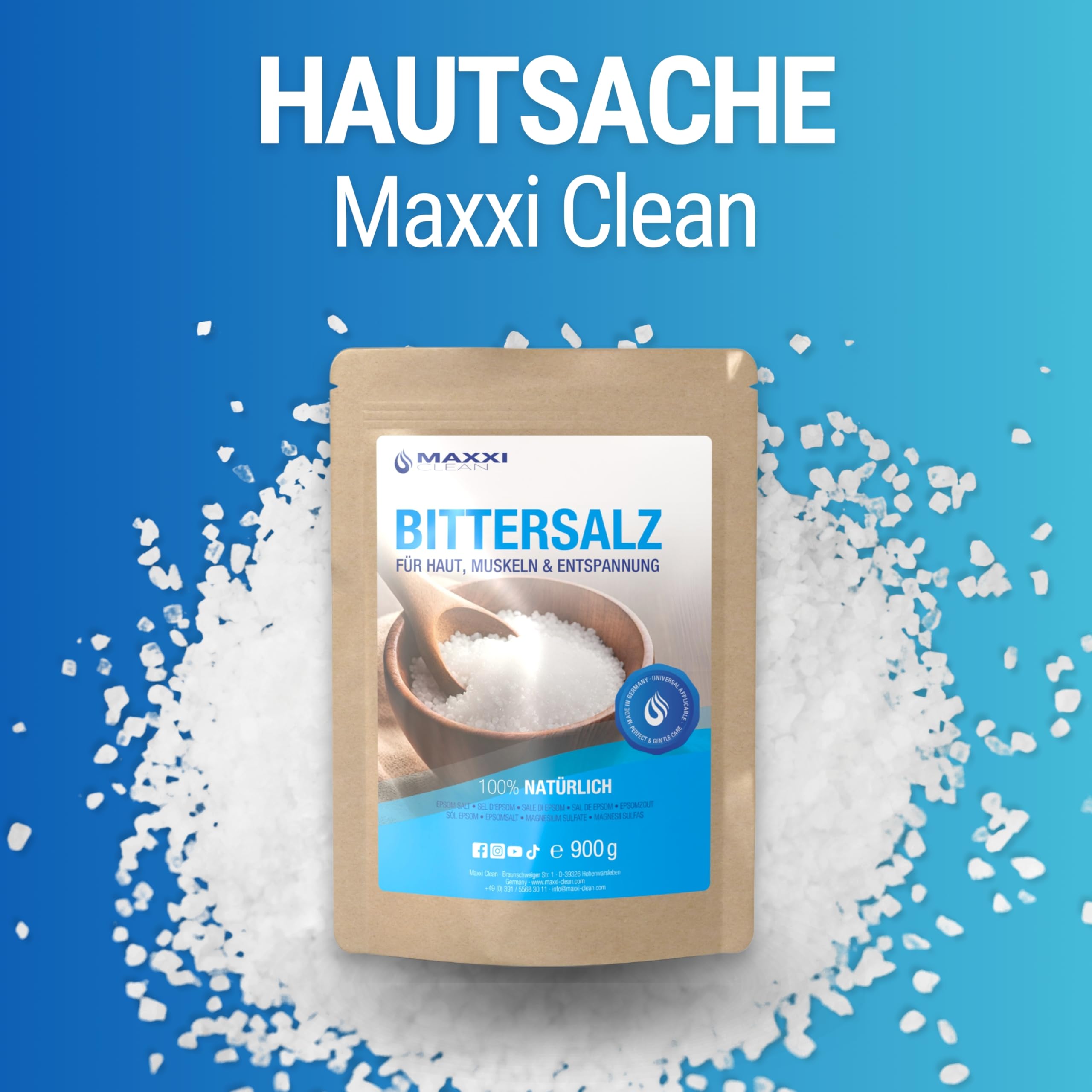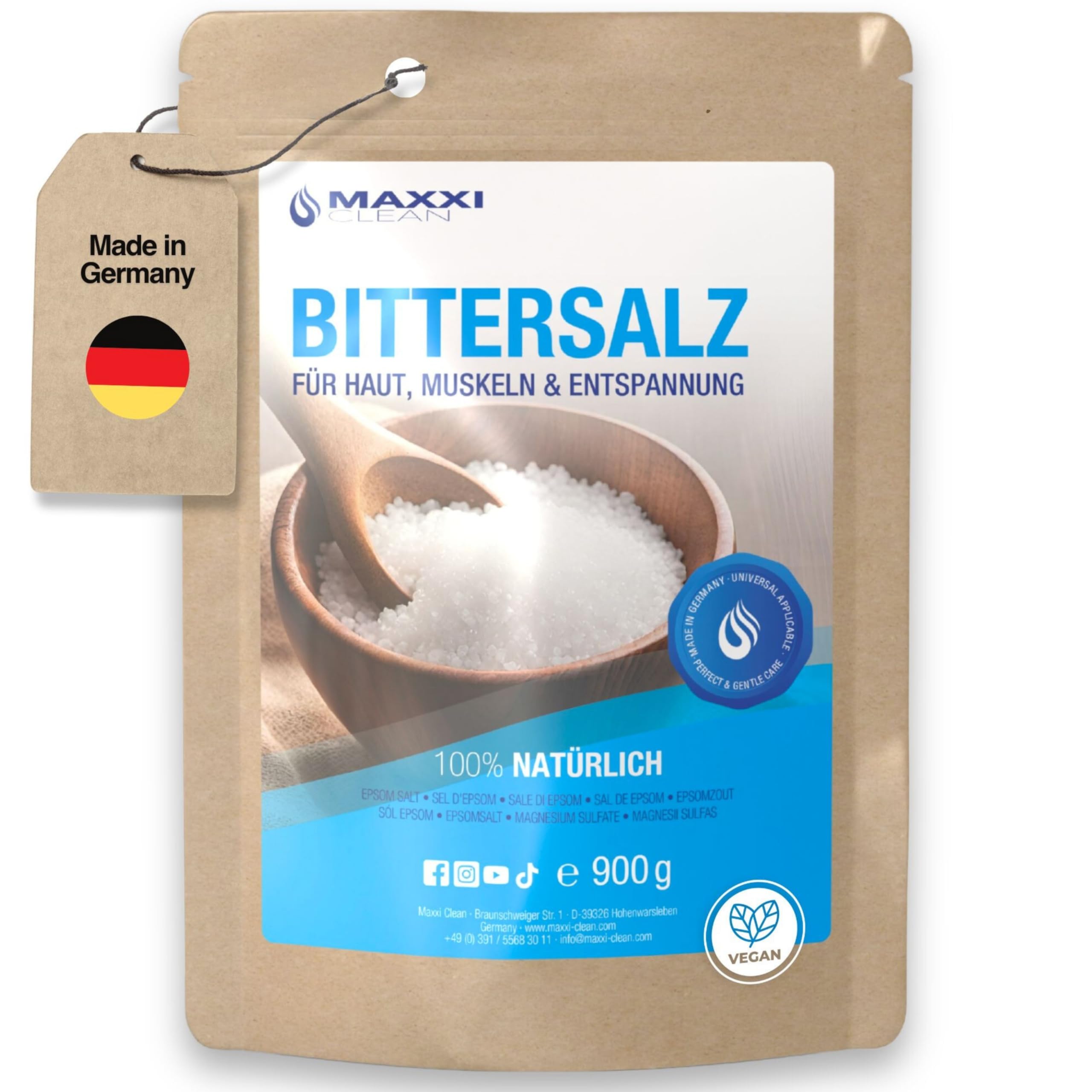 Maxxi Clean 900g Bittersalz – Hochreines Badesalz für Wellness & Körperpeeling, Epsom Salt Made in Germany, Magnesium, Pure Entspannung für Muskeln, Haut & Seele