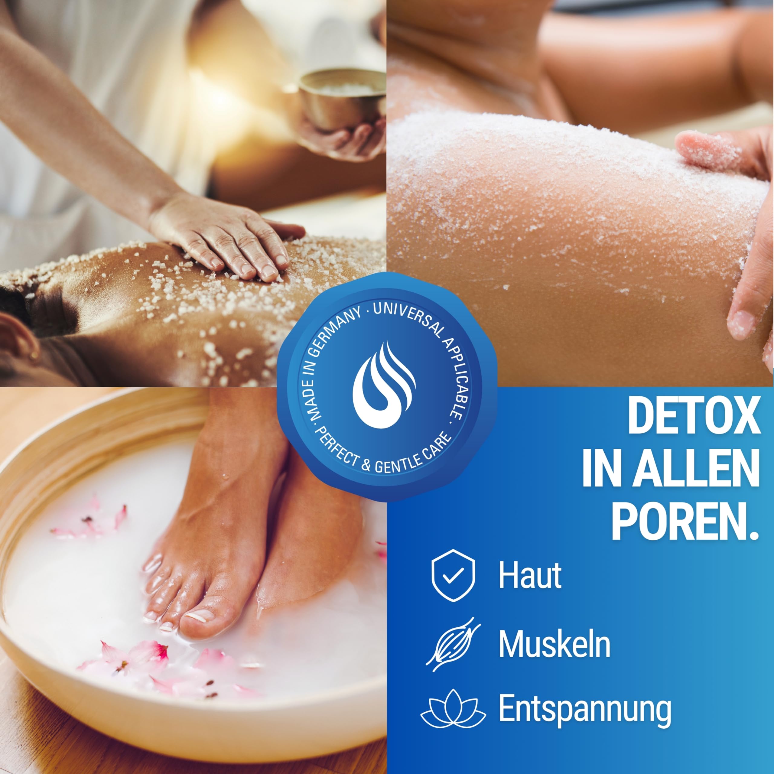 Fördert die Hautgesundheit: Das Salz wirkt als sanftes Körperpeeling, das abgestorbene Hautzellen entfernt, die Blutkreislauf fördert und die Haut geschmeidig macht.