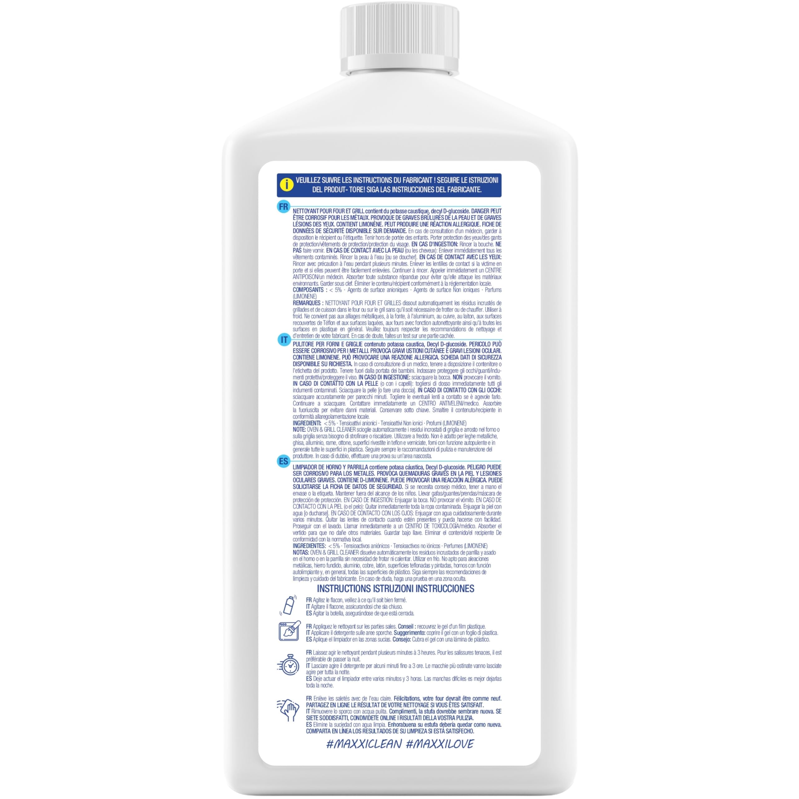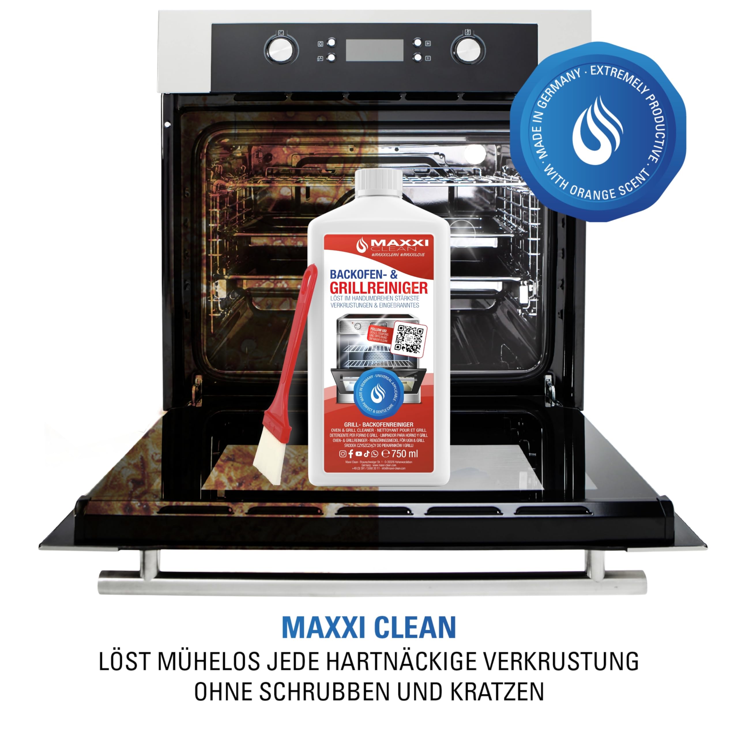 MAXXI CLEAN | Backofen & Grillreiniger - das Original | 1x 750 ml + 1x Pinsel | extra stark & selbstarbeitender Fettlöser | löst Verkrustungen auf Herdplatte, Ofen & Grill