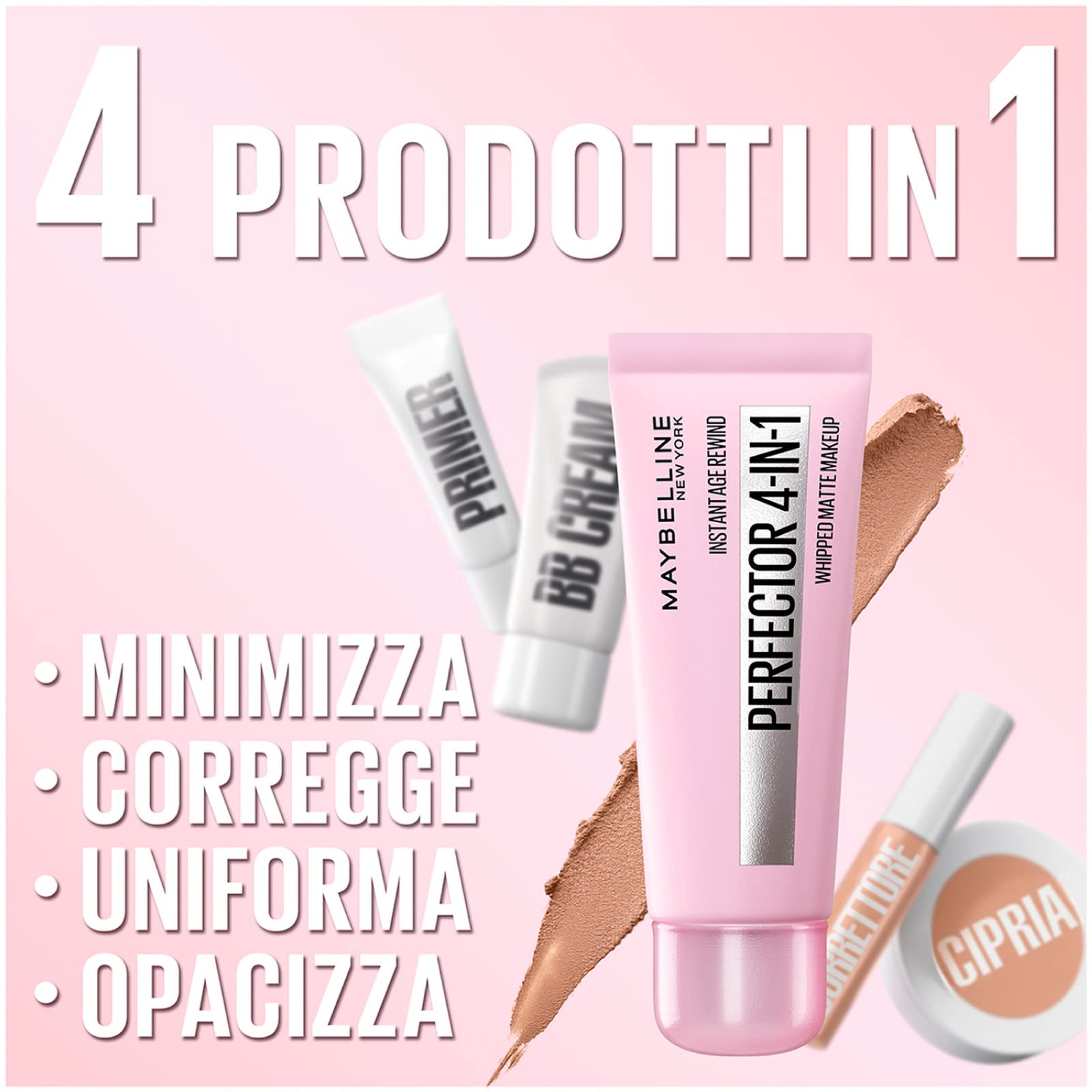 Perfektionierende Foundation, die die Vorteile von Primer, Concealer, BB Cream und Puder in einem einzigen und einfachen Produkt kombiniert, ideal für normale bis fettige Haut - Perfekter und matter Teint und ebenmässiger Hautton, minimierte Poren und Rötungen und Hautunreinheiten sofort korrigiert - Nach der Reinigung des Gesichts eine haselnussgrosse Menge des Produkts mit den Fingerspitzen gleichmässig auf das gesamte Gesicht auftragen. makelloses und gleichmässiges Ergebnis - Zarte und luftige Mousse Textur für ein ultra-natürliches Ergebnis, Vegane Formel ohne Inhaltsstoffe oder tierische Nebenprodukte, Made in Italy - Inhalt: 1 x Maybelline NEW YORK Perfektionierende Instant Perfector, 30 ml, Farbtöne: Medium