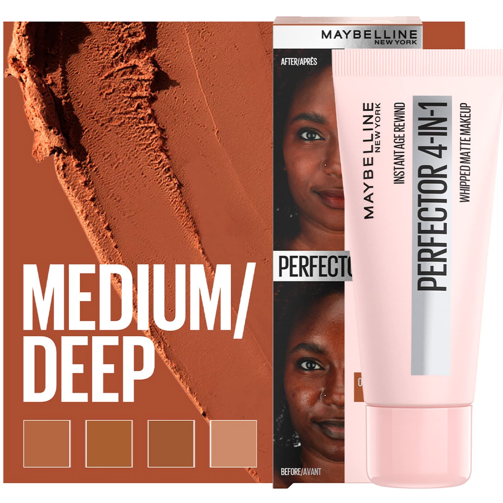 Mindestanzahl für die Bestellung von "Maybelline New York Instant Age Rewind Perfector 4in1 Perfektionierende Foundation Matte 04 Medium/Deep - Flasche mit 30 ml" ist 1.