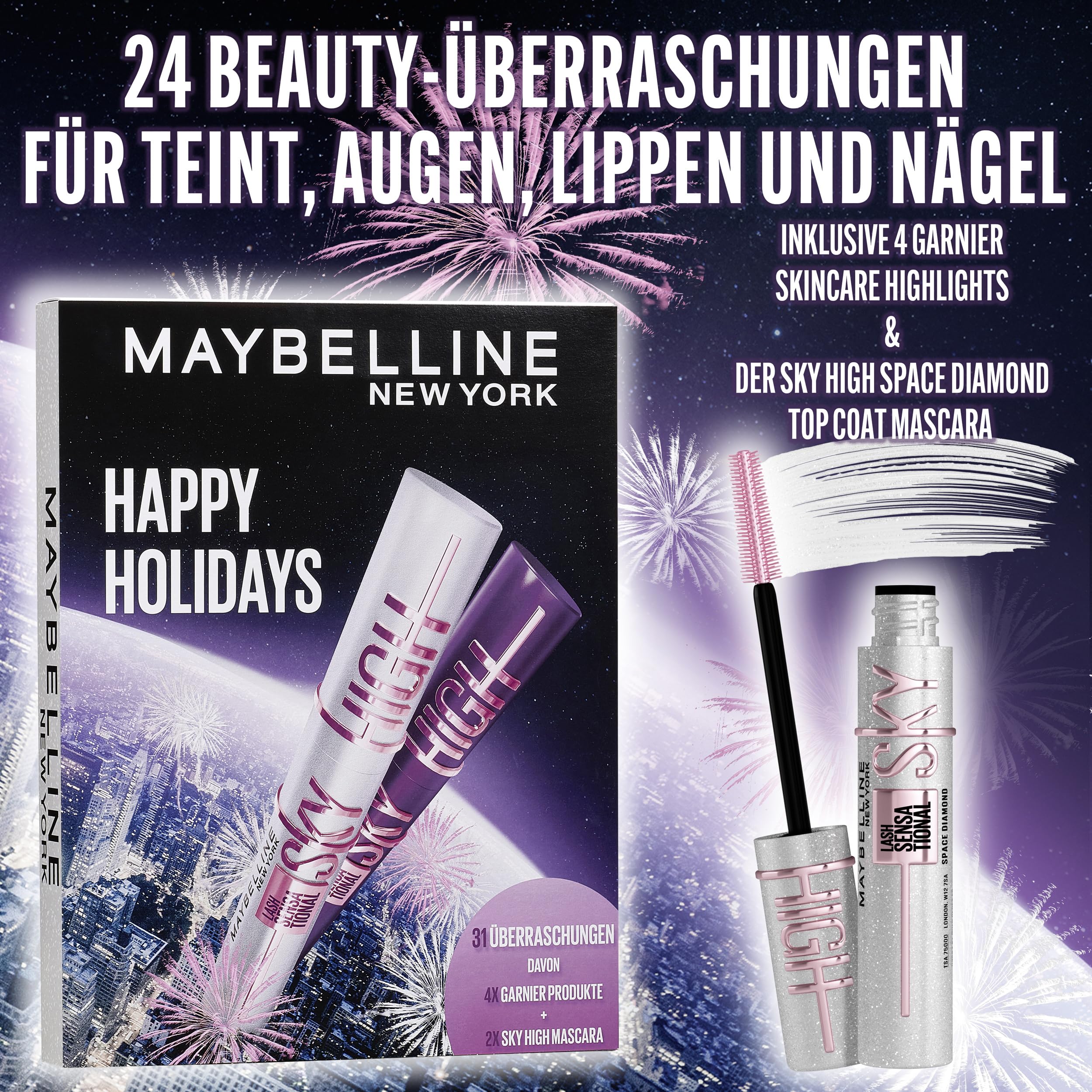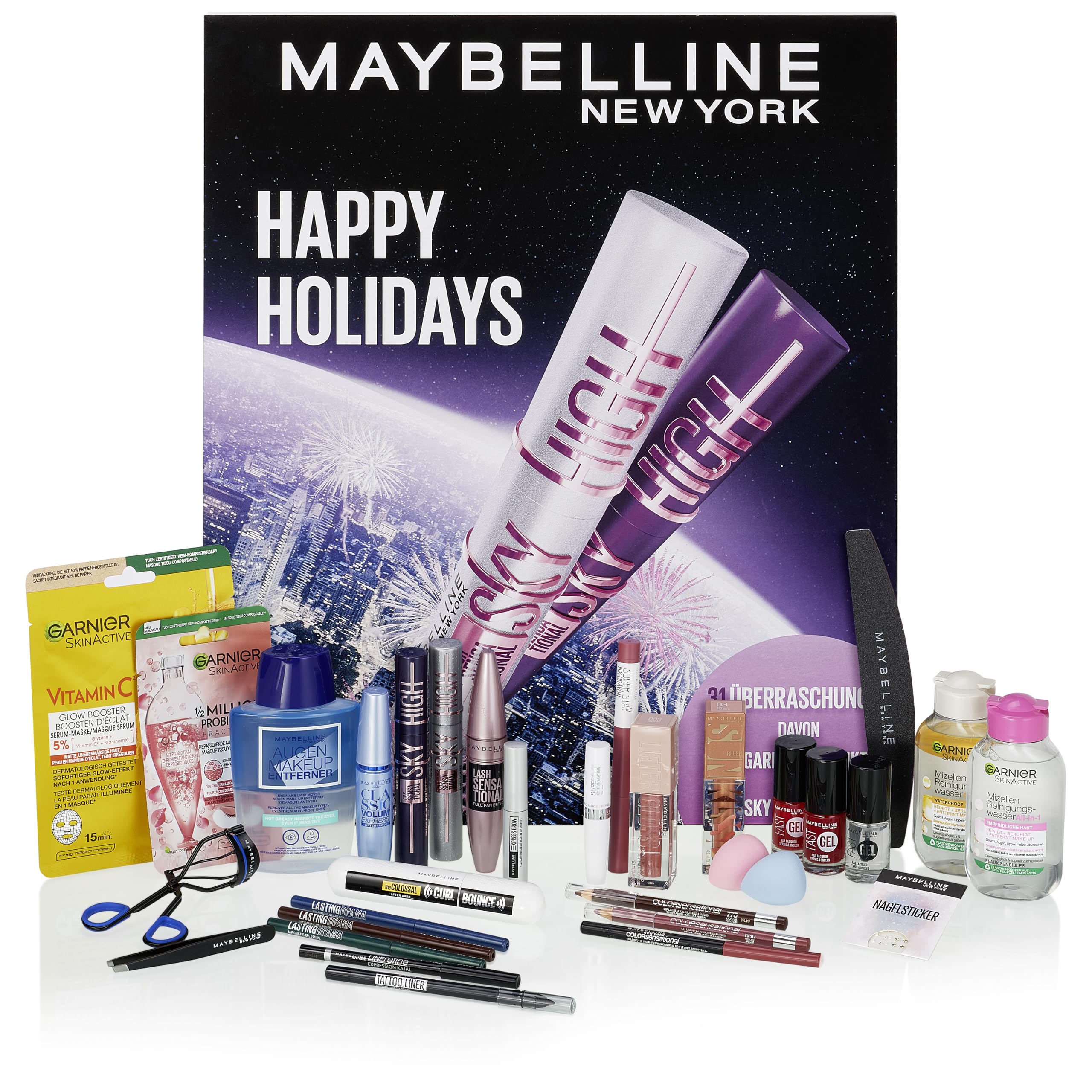 Maybelline New York Adventskalender 2025, Mit 31 Türchen für den gesamten Dezember, 26 Originalprodukten & 5 Goodies, inkl. 2 Sky High Mascara + 4 Garnier Skincare Produkten