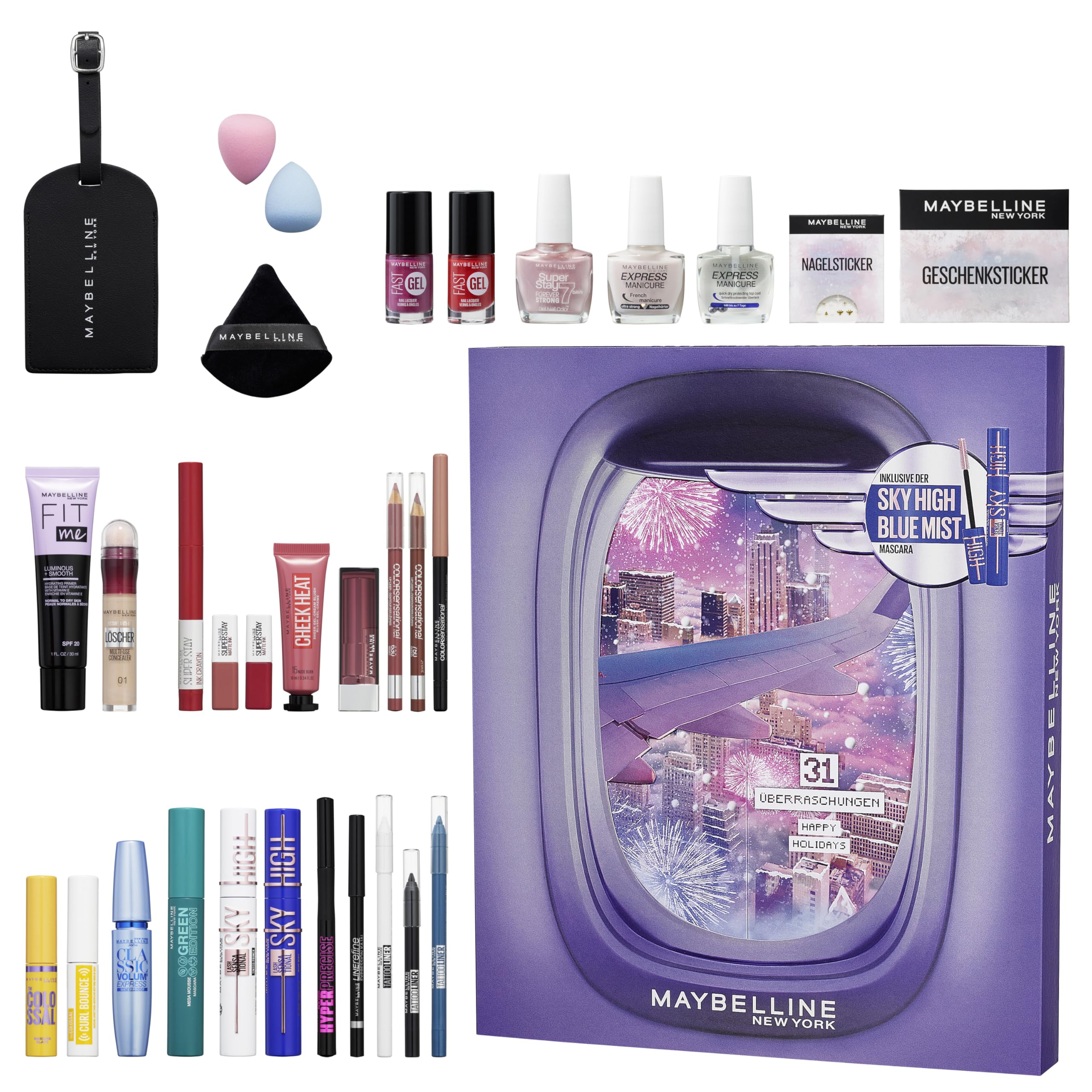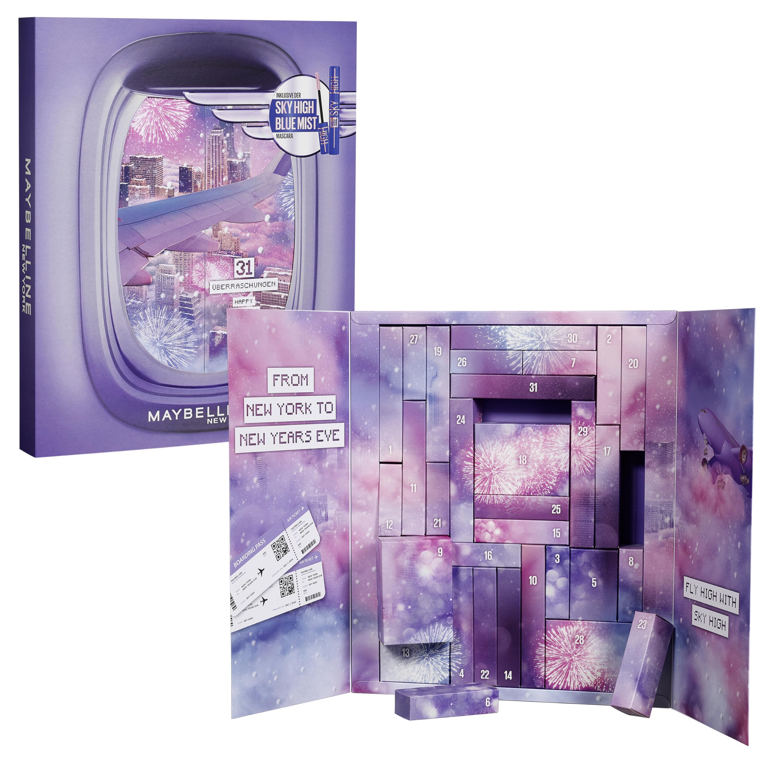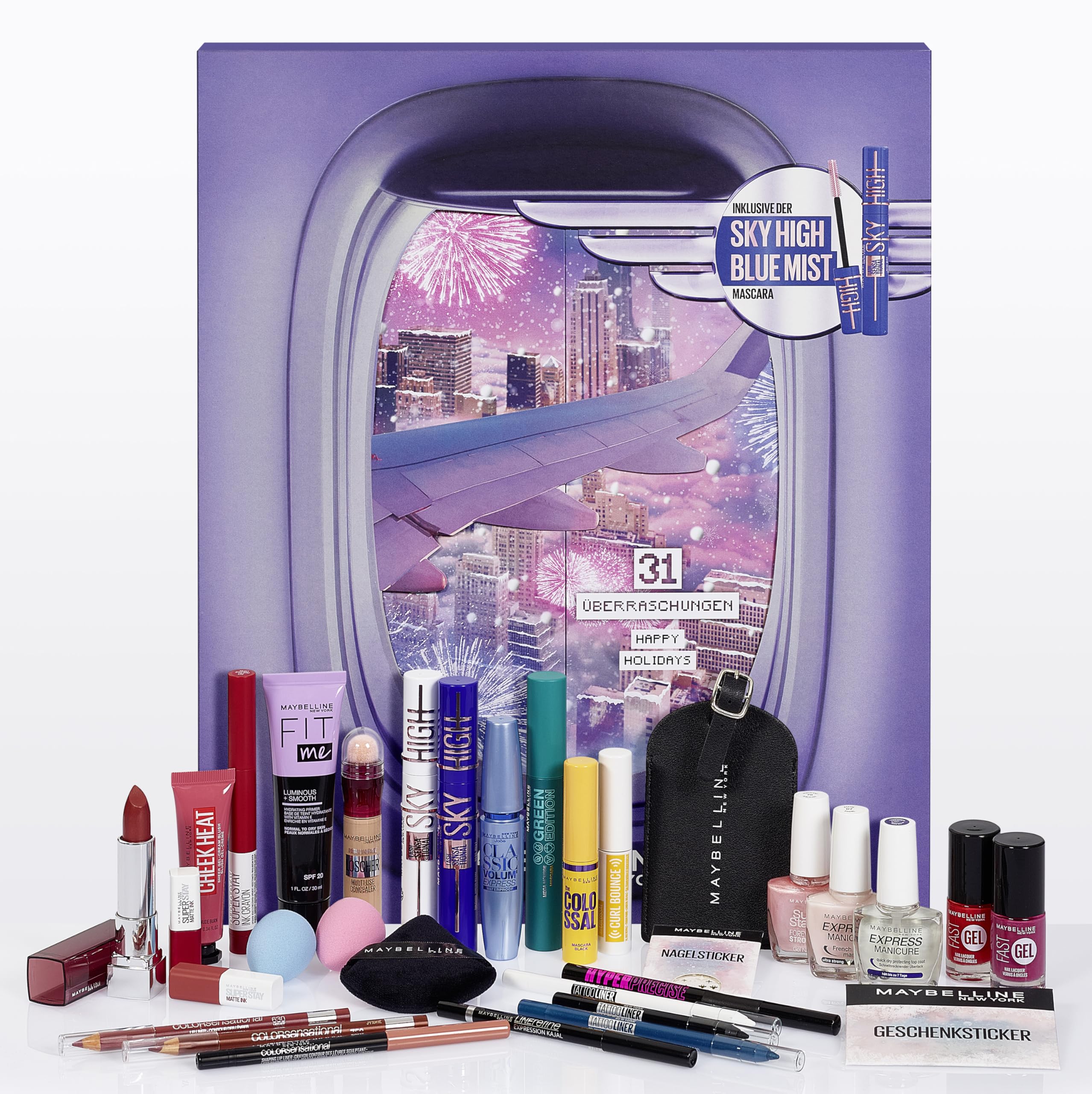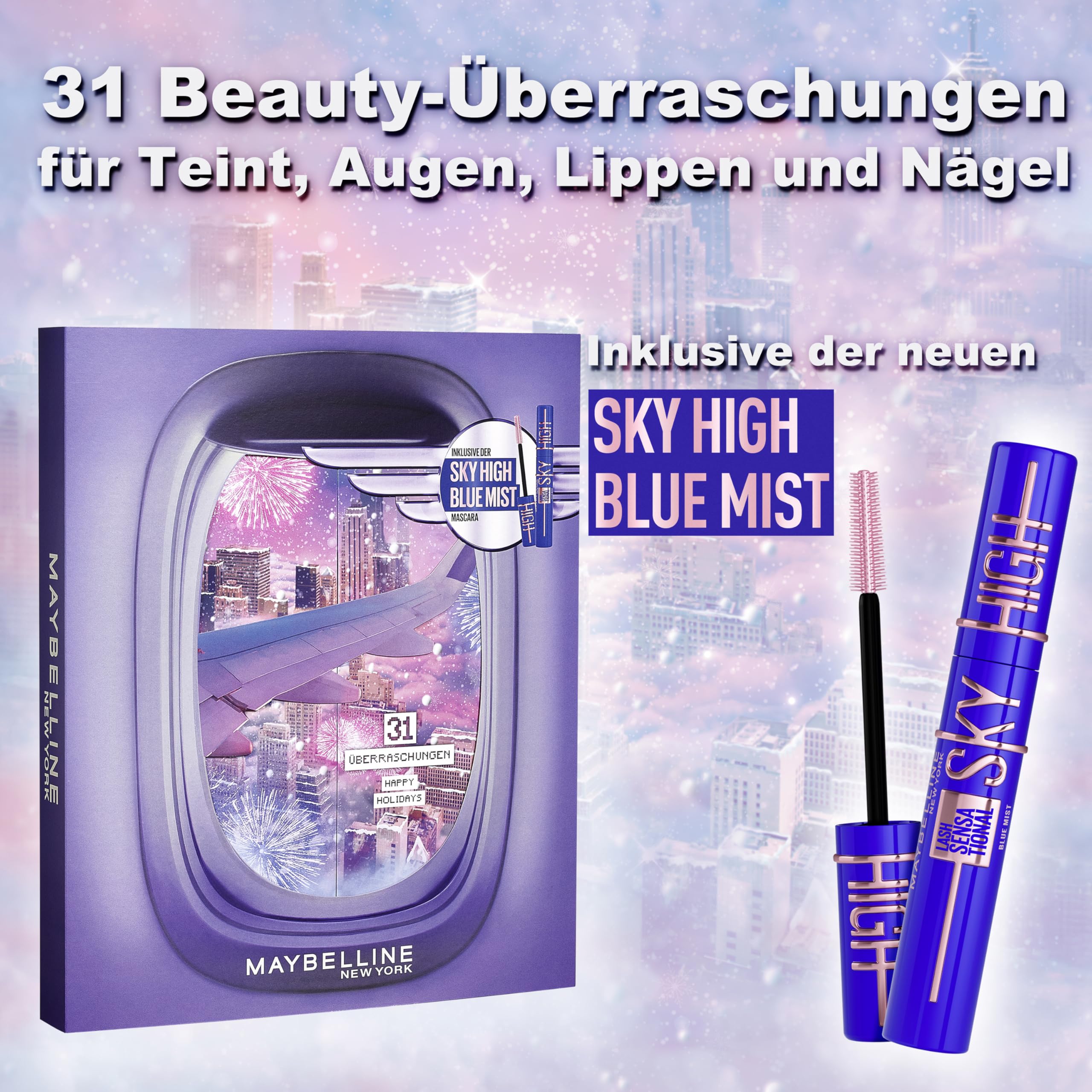 • Der Maybelline Adventskalender versüsst die Vorweihnachtszeit mit 31 Überraschungen aus dem Beauty-Segment inkl. der Sky High Blue Mist Mascara