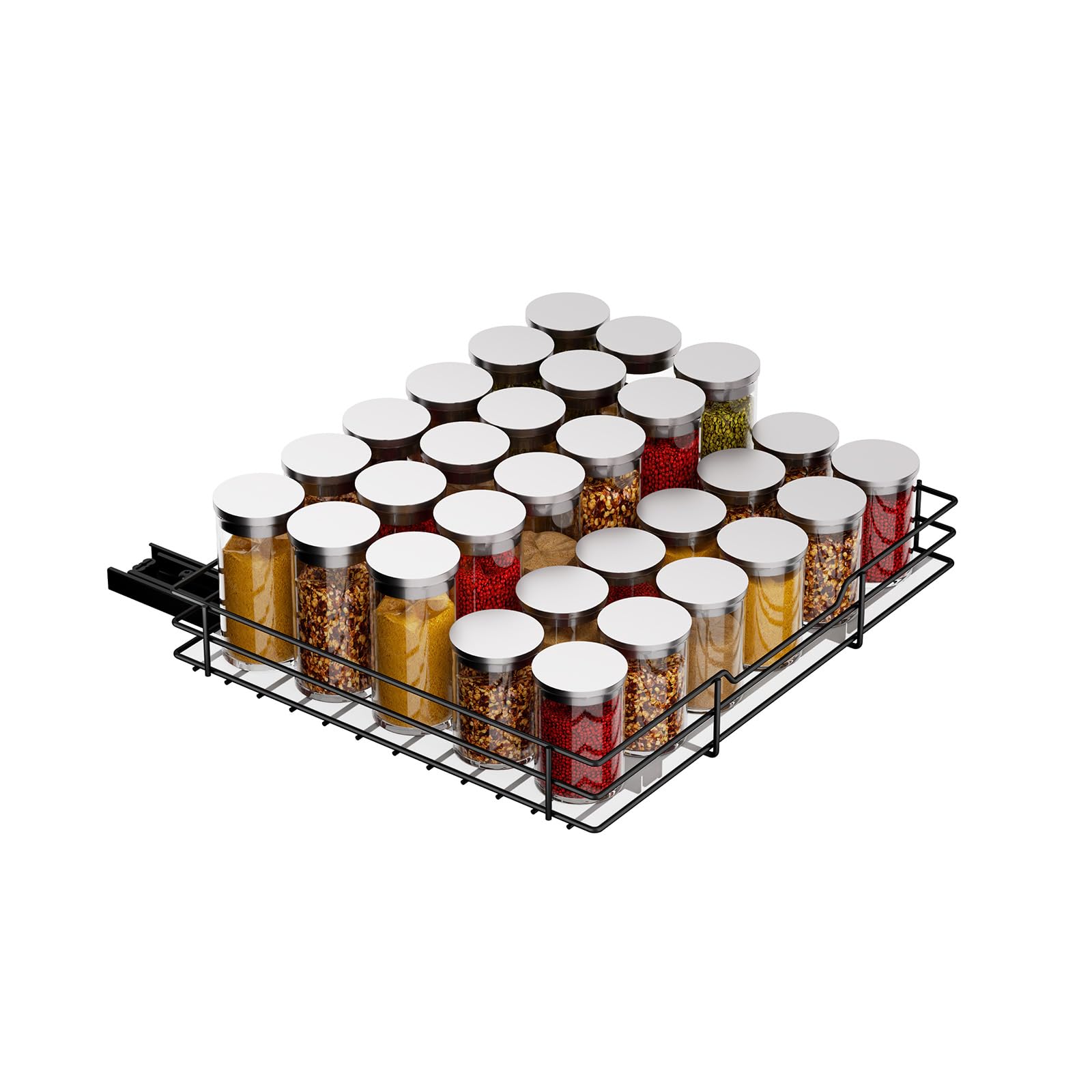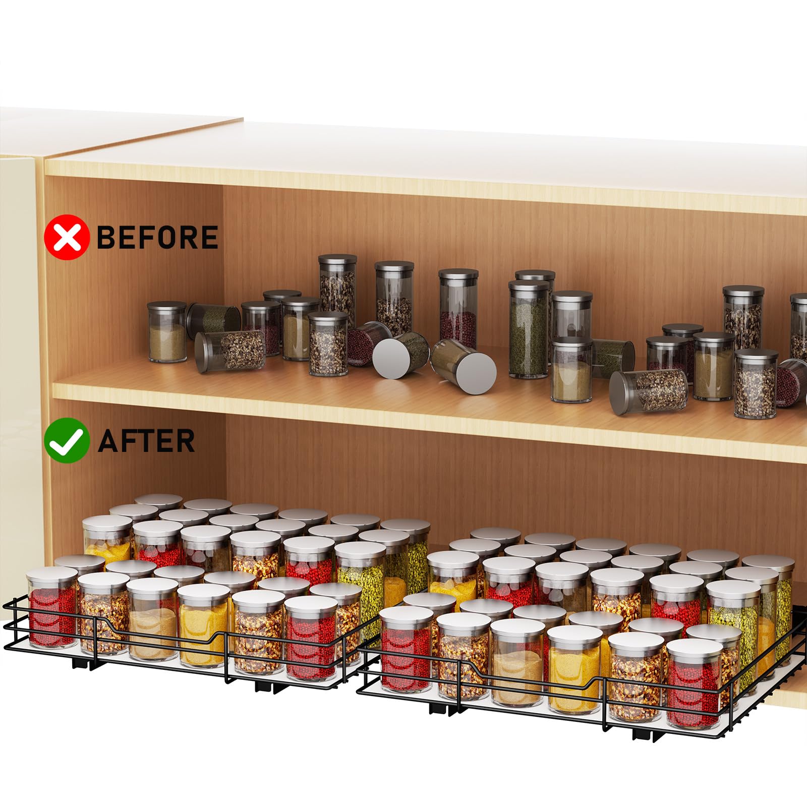 - ????【Ausziehbares Gewürzregal】 Unser Gewürzregal verfügt über Kugellagersystem sorgt für ein reibungsloses Gleiten auf den Schienen, sodass Sie das Regal auch dann leicht herausziehen können, wenn es voller Gewürzflaschen ist, sodass Sie problemlos auf alle Gewürze in Ihrem tiefen Schrank zugreifen können.(Hinweis: Gewürzflaschen sind nicht im Lieferumfang enthalten)