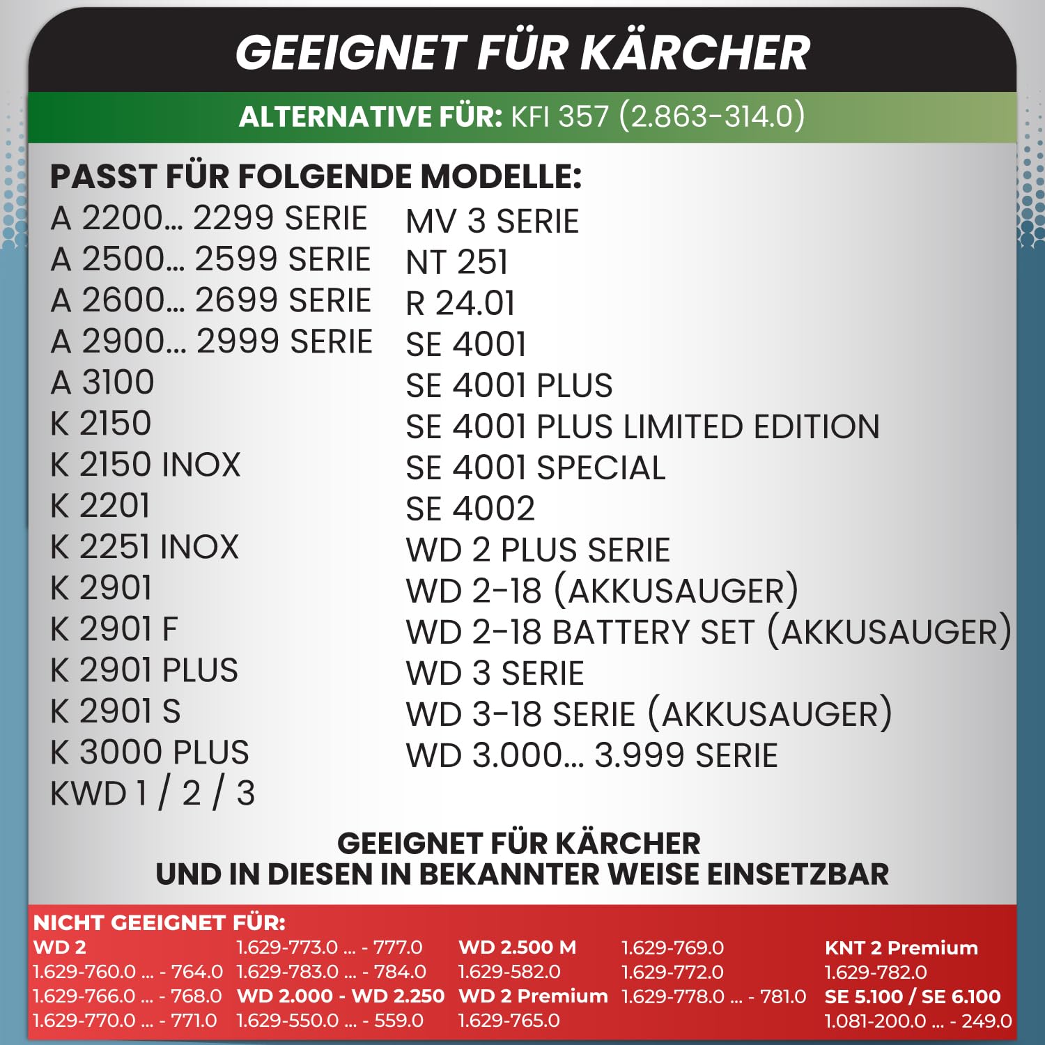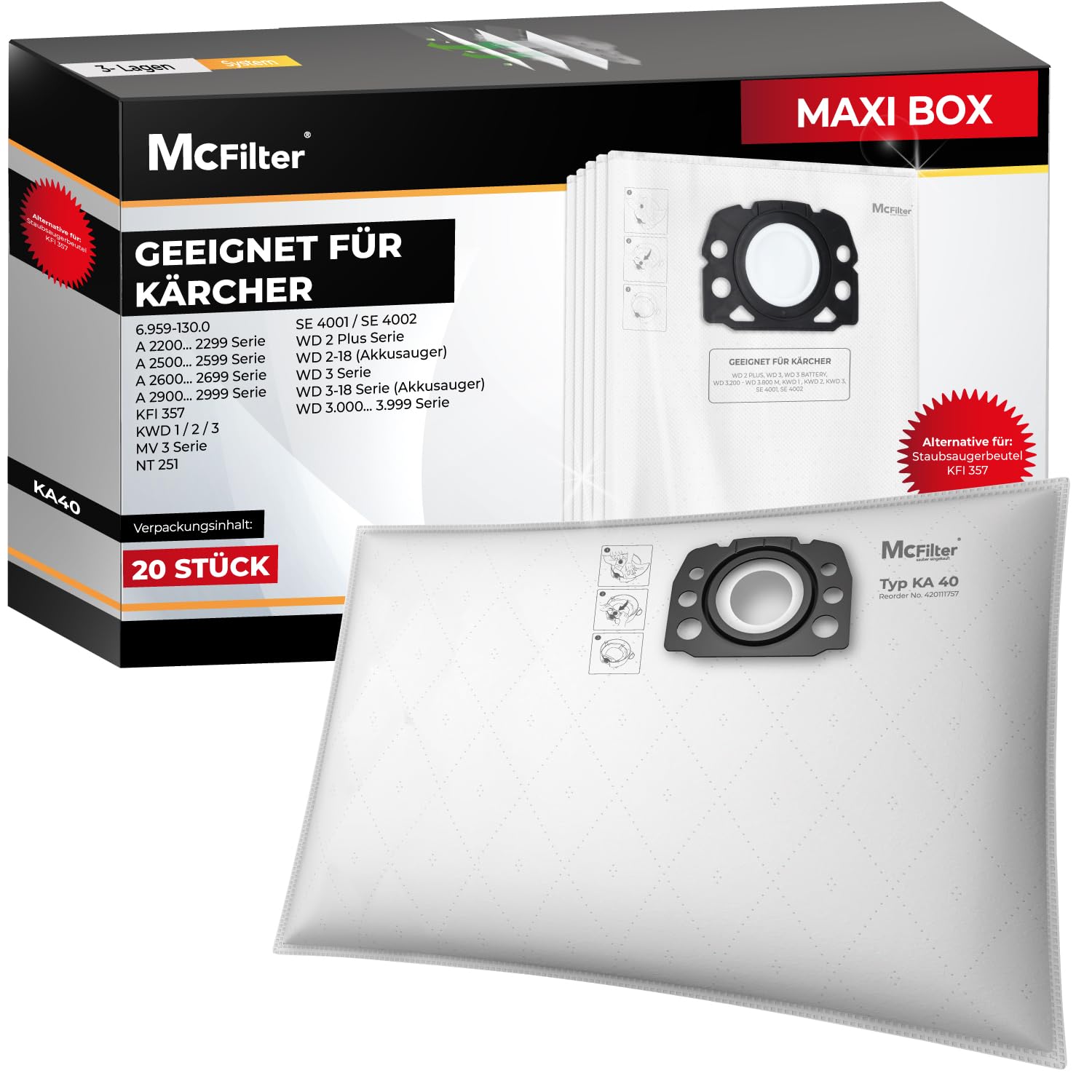 • Top Alternative - zum Beutel von Kärcher, entspricht der Kärcher Nummer KFI 357 2.863-314.0, passend für WD 3 S WD 3 V-17/4/20 WD 2 Plus I WD 3 S I KWD 1 I KWD 2 I KWD 3V I WD 3.200-WD 3.800 M I SE 4001 I SE 4002