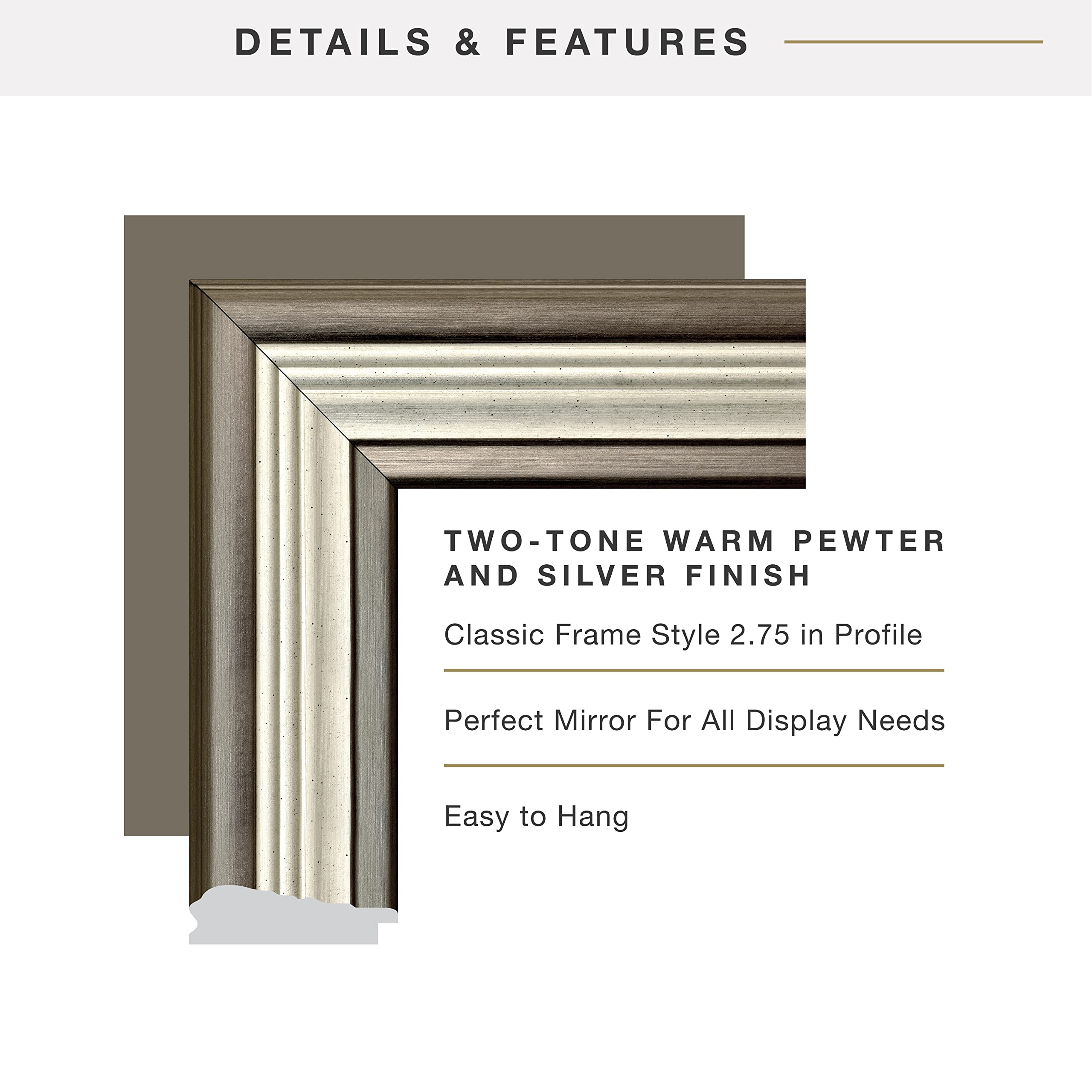 A series of mirrors that are lightweight and easy to hang that rivals any material in beauty and flexibility in the home. Nice wide frame moldings covered in decorative foil to enhance any room. This series offers several different frame moldings in an array of textures and colors.
