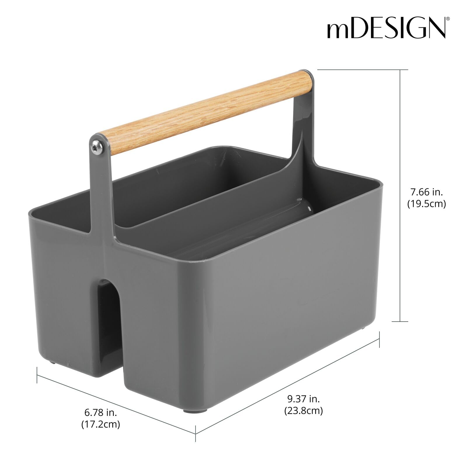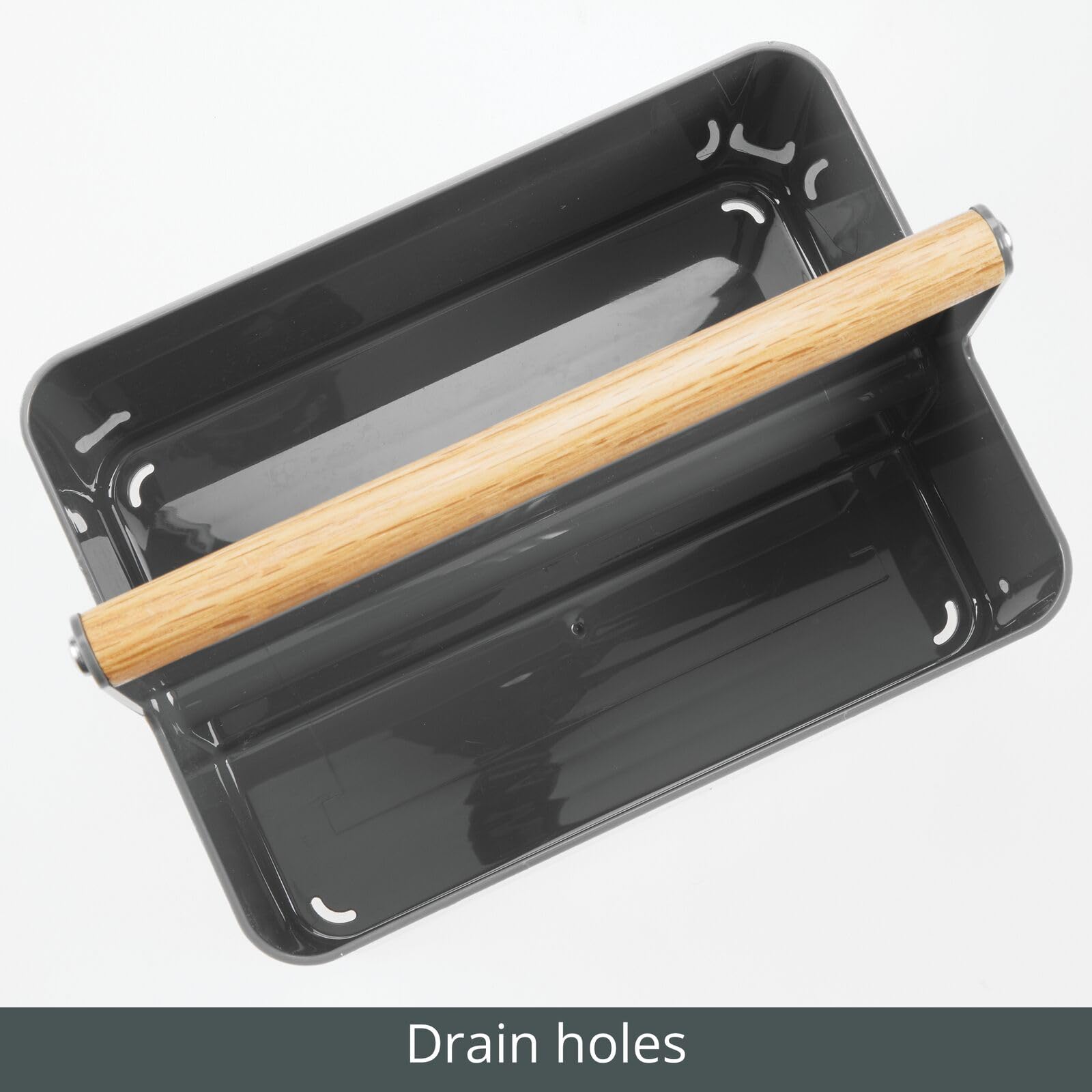 Sorgen Sie für Ordnung und Harmonie im Badezimmer und im Rest des Hauses mit diesem Unterbecken-Aufbewahrungsbehälter von mDesign. Dieser Badezimmer-Schrank-Organizer ist eine effektive Möglichkeit, die Ordnung in unordentlichen Bereichen des Hauses wiederherzustellen. Der Organizer verfügt über zwei separate Fächer mit einem zentralen Holzgriff, wodurch er sich leicht im Haus bewegen lässt. Jedes Fach hat genug Platz, um mehrere Gegenstände gleichzeitig zu verstauen. Zur Aufbewahrung von Kosmetika, Küchenutensilien, Reinigungsmitteln, Make-up und vielem mehr. Stellen Sie es im Badezimmer, in der Küche, im Schlafzimmer und überall sonst im Haus auf. Die Produktdetails Badezimmer, Küche, Schlafzimmer Organizer Verwendung als Make-up-Aufbewahrung, Reinigungsmittel Aufbewahrung und mehr. Halten Sie das Zuhause organisiert und ordentlich. Material: Kunststoff und Holz. Farbe: Anthrazitgrau/Natur. Masse: 23,9 x 17,3 x 19,3 cm. Modellnummer: 06169MDBSTEU