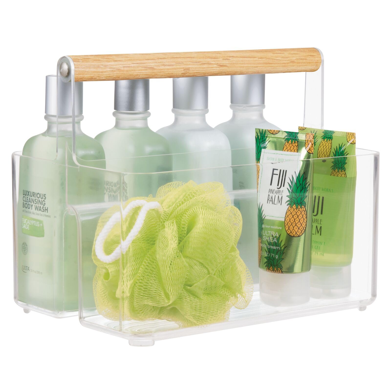 Sorgen Sie für Ordnung und Harmonie im Badezimmer und im Rest des Hauses mit diesem Unterbecken-Aufbewahrungsbehälter von mDesign. Dieser Badezimmer-Schrank-Organizer ist eine effektive Möglichkeit, die Ordnung in unordentlichen Bereichen des Hauses wiederherzustellen. Der Organizer verfügt über zwei separate Fächer mit einem zentralen Holzgriff, wodurch er sich leicht im Haus bewegen lässt. Jedes Fach hat genug Platz, um mehrere Gegenstände gleichzeitig zu verstauen. Zur Aufbewahrung von Kosmetika, Küchenutensilien, Reinigungsmitteln, Make-up und vielem mehr. Stellen Sie es im Badezimmer, in der Küche, im Schlafzimmer und überall sonst im Haus auf. Die Produktdetails Badezimmer, Küche, Schlafzimmer Organizer Verwendung als Make-up-Aufbewahrung, Reinigungsmittel Aufbewahrung und mehr. Halten Sie das Zuhause organisiert und ordentlich. Material: Kunststoff und Holz. Farbe: klar/natürlich. Masse: 23,9 x 17,3 x 19,3 cm. Modellnummer: 09788MDBSTEU
