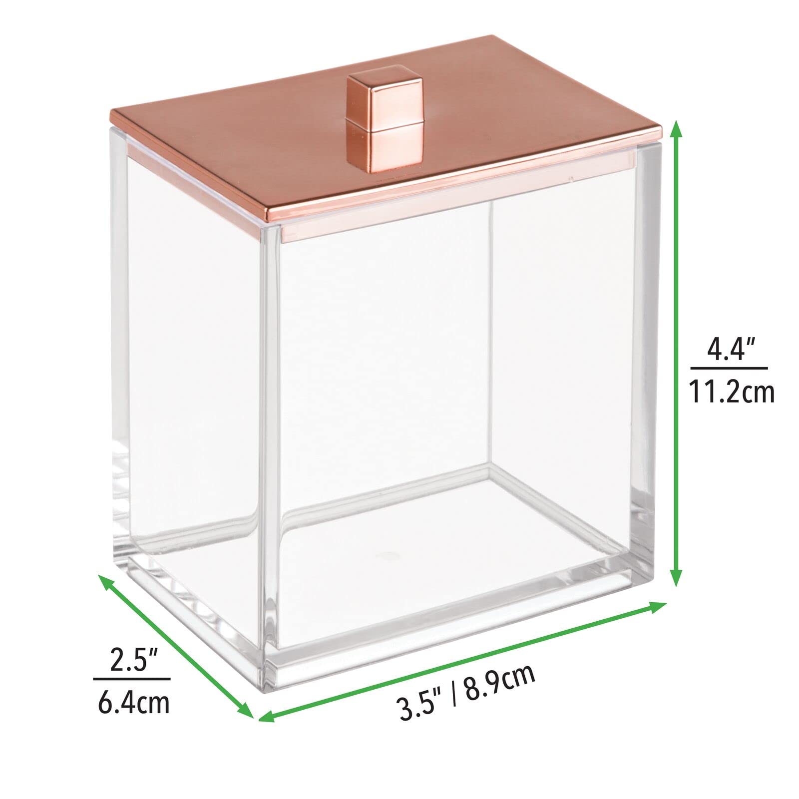 Praktische Aufbewahrungsbox für das Badezimmer von mDesign - Wattepads, Wattestäbchen, Haargummis usw. Diese mDesign Aufbewahrungsboxen bieten stilvollen Stauraum für Ihre Spüle oder Ihren Schminktisch. Sie eignen sich perfekt als Wattestäbchenspender oder als Wattebox, da sie über Deckel verfügen, die den Inhalt trocken halten. Auch Badesalz oder andere Hygieneprodukte können Sie problemlos in diese Aufbewahrungsboxen legen. Sie sind praktische Kosmetik-Organizer. Die Produkteigenschaften im Detail Aufbewahrungsboxen für das Badezimmer 2 Stück für die Aufbewahrung von Wattestäbchen, Wattestäbchen, Haargummis usw. Grosse Öffnung mit Deckel. Material: Kunststoff. Farbe: transparent / roségold. Masse: 8,9 cm x 6,4 cm x 11,1 cm. Modellnummer: 8710MDBAEU
