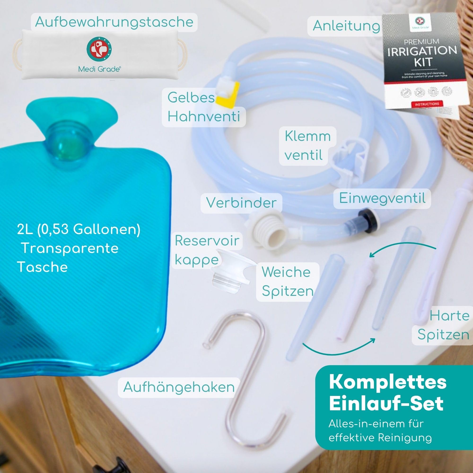 Medi Grade Enema Kit 2 Liter, transparentes Einlaufset fuer Erwachsene mit Rueckflussventil