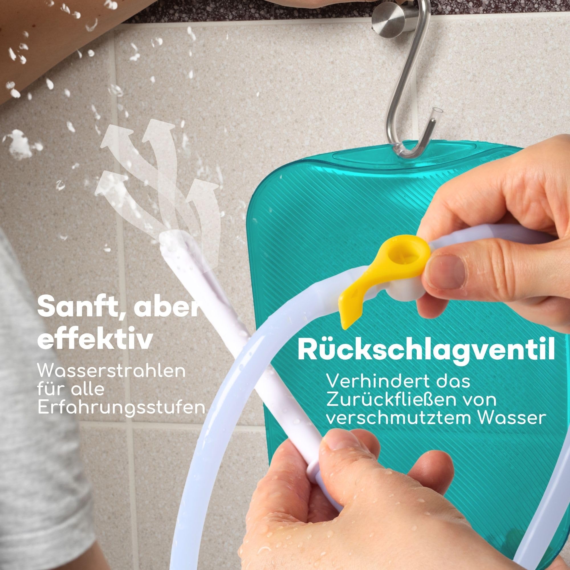 Die Wasserzufuhr laesst sich ueber einen ergonomischen Absperrhahn praezise regulieren. Dadurch kann der Durchfluss individuell und kontrolliert gesteuert werden. Zum Set gehoert ein flexibler Silikonschlauch mit einer Laenge von ca. 1,8 m, der eine komfortable Handhabung unterstuetzt.