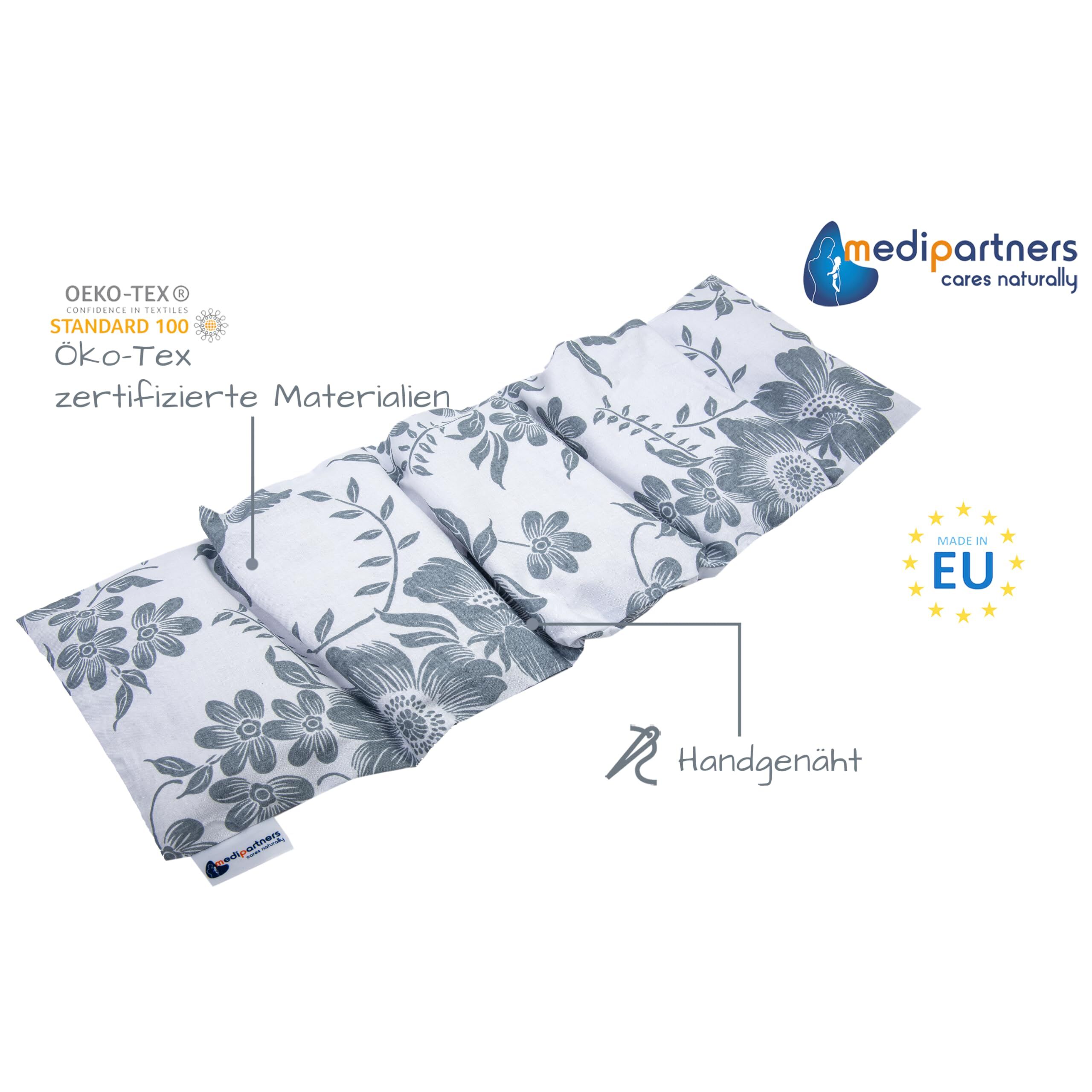 Wärmeanwendung: - Schmerzen, die mit der Muskelverspannung verbunden sind - rheumatische Schmerzen - Durchblutungsstörungen - schmerzhafte Menstruation - neurologische Beschwerden - Massage der Wirbelsäule Kaltanwendung: - Prellungen, Verstauchungen, Quetschungen - Kopfschmerzen, Migräne - Insektenstiche - Kompression bei Kontraktion der Gebärmutter oder des Brustpakets - Beseitigung von Schwellungen nach Zahnarztbesuchen Zur Herstellung verwendete Stoffe: - 100% Baumwolle - Gereinigte und ausgetrocknete Kirschkernen Wir wird die Wärmflasche erwärmt? - in der Mikrowelle, 300-600 W, max. 1 Minute - im Backofen, 120° C, ca. 4 Minuten - auf dem Heizkörper – bis die Wärmflasche genug warm ist Wie wird die Wärmflasche gekühlt? Für ca. 30-60 Minuten in den Gefrierschrank legen. Am bestem in einer sauberen und trockenen Folientüte. Die Wärmflasche darf nicht gewaschen werden. Beim Waschen verlieren die Kirschkernen ihre geringe Feuchtigkeit und nach Erwärmen kann es zur Verbrennungsgefahr kommen. Bei Verschmutzungen kann die Baumwolle mit einem feuchten Tuch abgewischt werden.