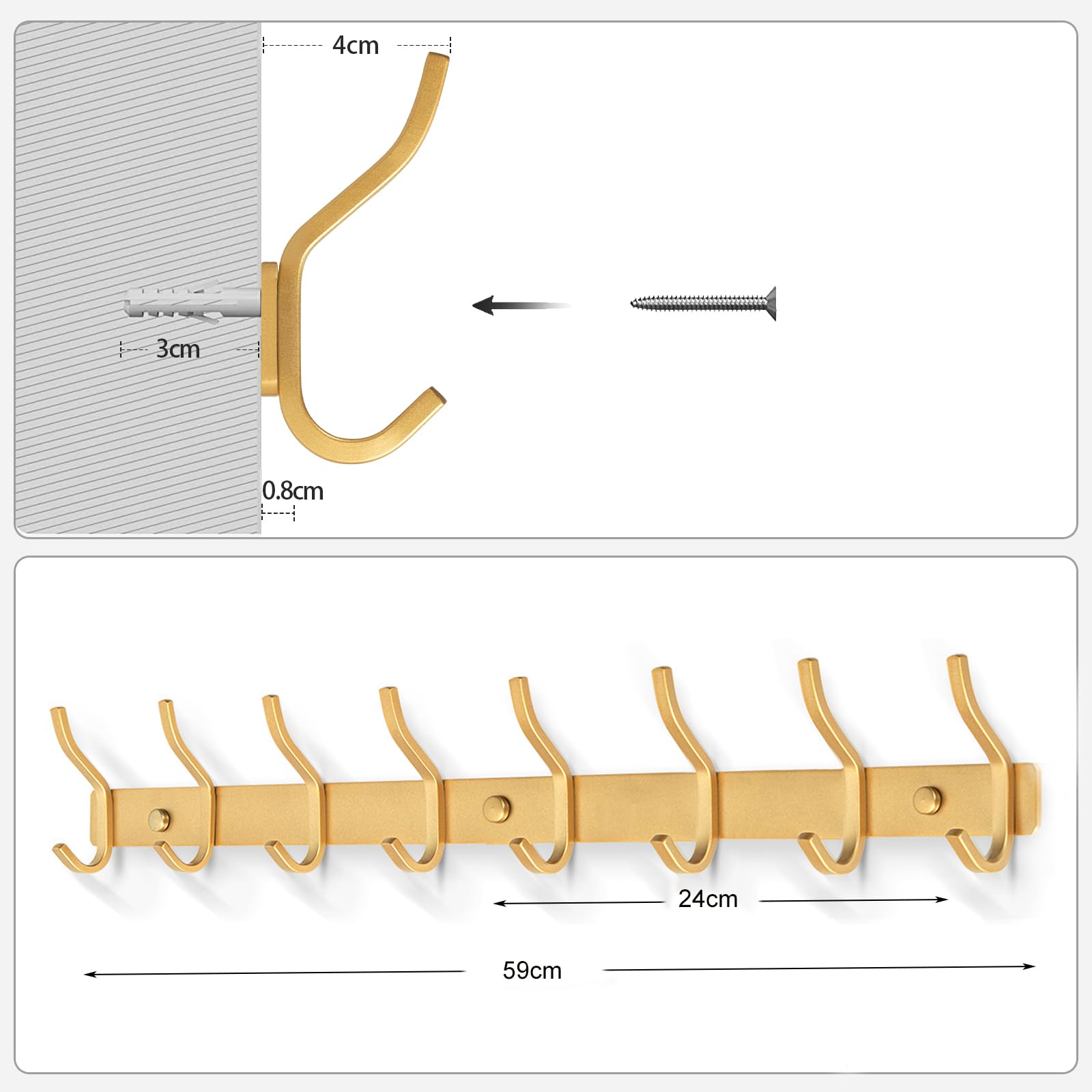MEIJO Garderobenhaken Edelstahl, Hakenleiste Kleiderhaken Wand mit 8 Haken, Garderobe Garderobenleiste Wandgarderobe für Schlafzimmer Bad Küche (8 Haken, Golden)