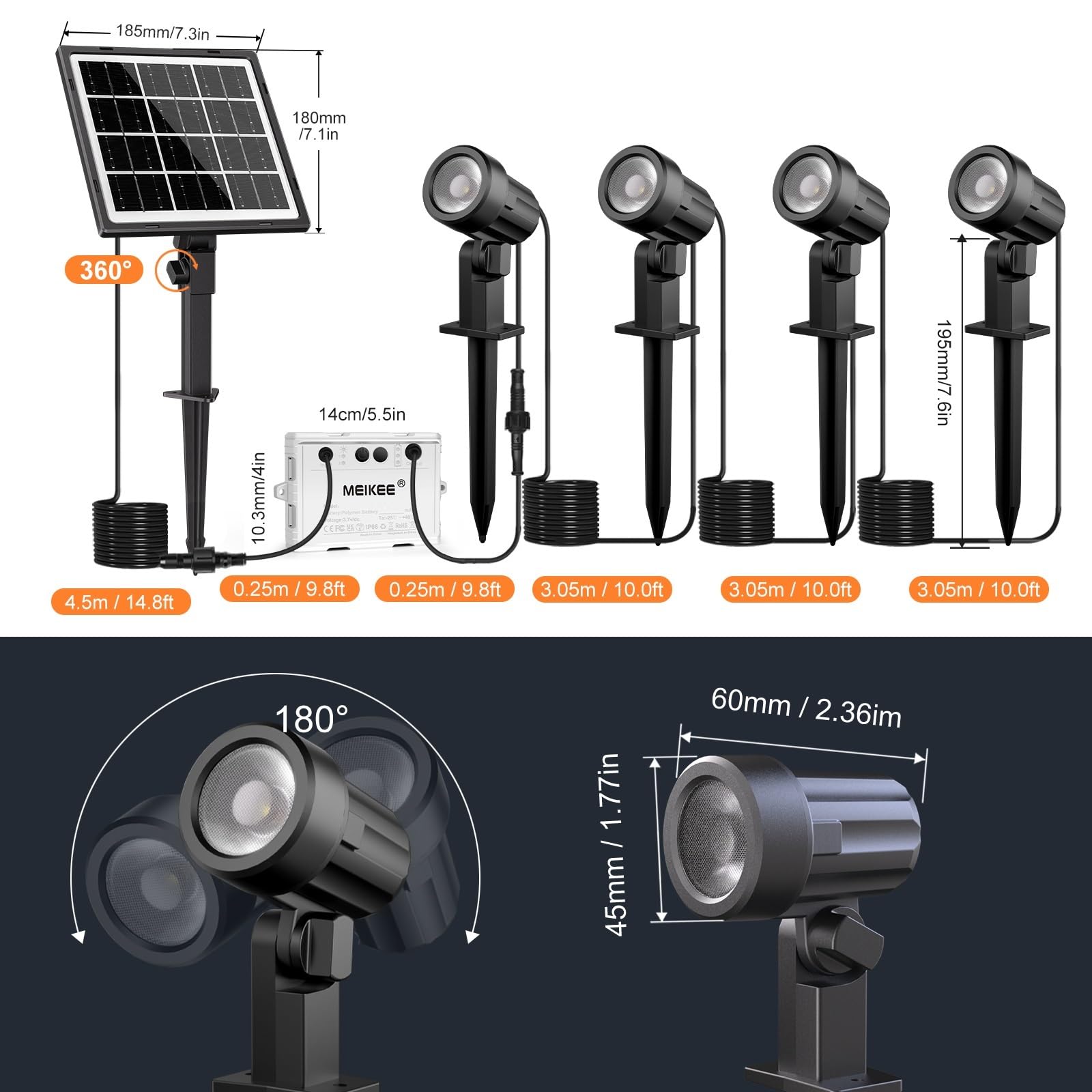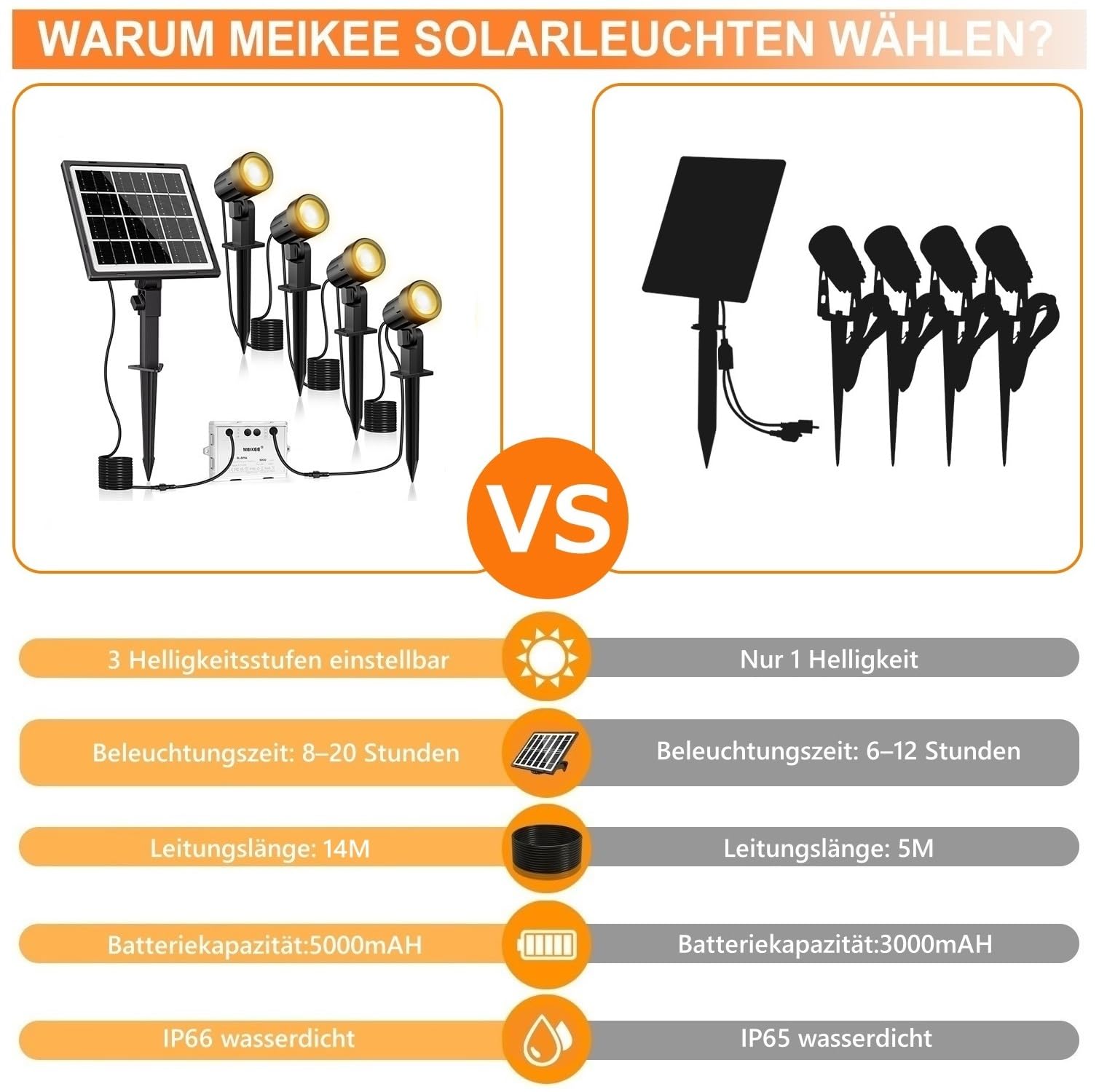 MEIKEE Solar Gartenleuchte 4 Stück 2700K Warmweiss 3 Helligkeit 2 Modi Gartenbeleuchtung mit Erdspiess 5000MAH IP66 Wasserdicht Solar Strahler für Aussen Garten Rasen Terrasse Baum Aussen