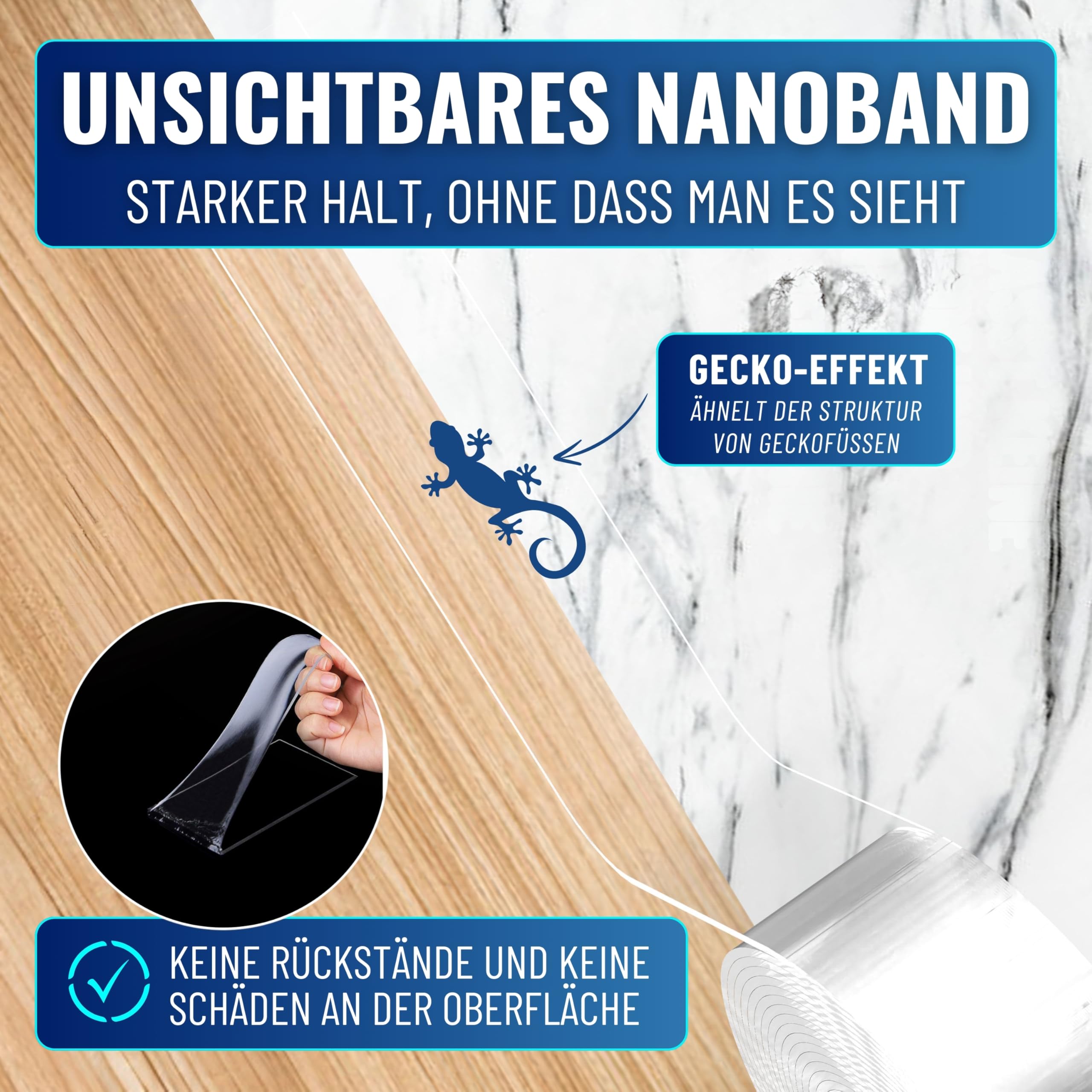 MEISTERWERK - Doppelseitiges Nano-Klebeband [EXTRA STARK] - Klebstofffrei & Spurlos dank Gecko-Effekt I Rutschfest - Waschbar & Wiederverwendbar