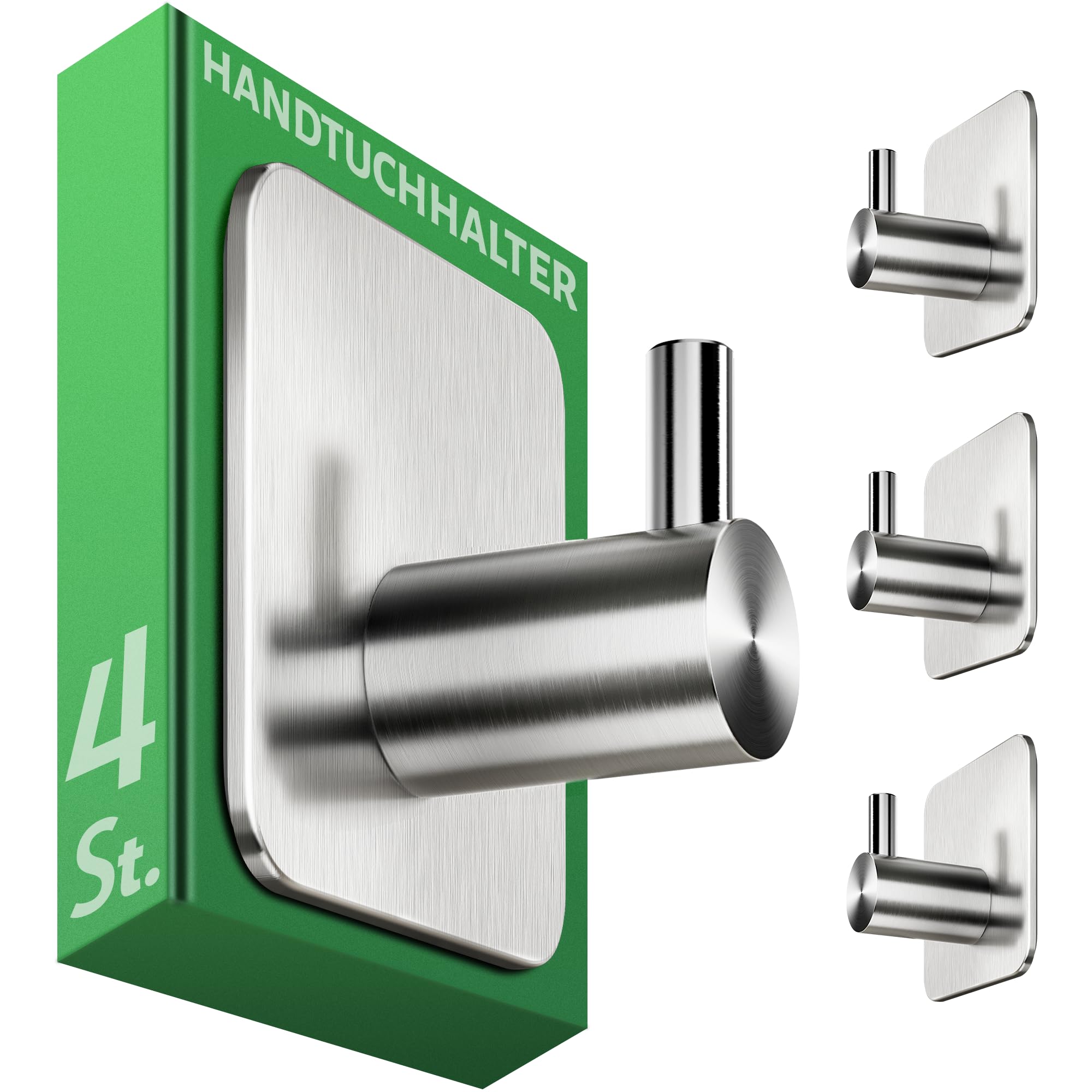 Menz Handtuchhaken ohne Bohren, 4er Pack – Extra starke Handtuchhalter ohne Bohren, Klebehaken Edelstahl, Haken selbstklebend mit wasserfesten Klebepads, Badezimmer Handtuchhalter, Fb. Silber
