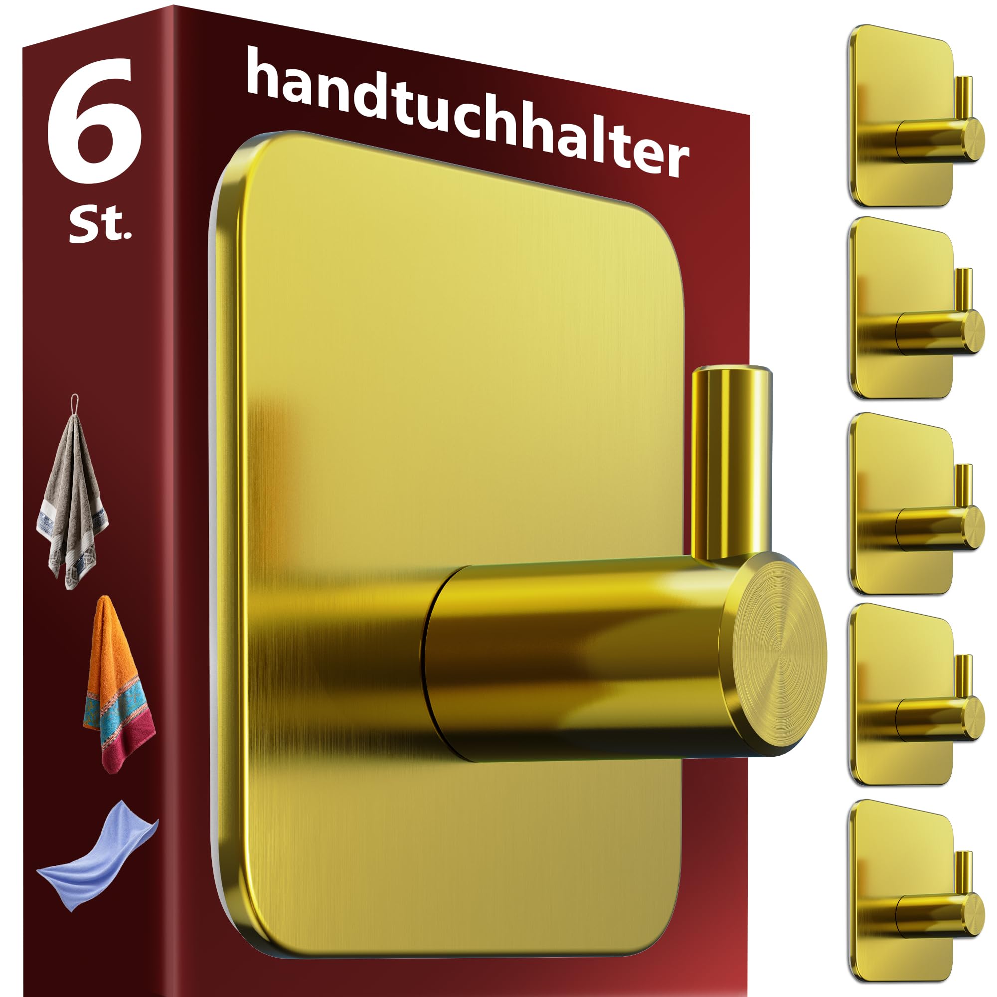 Menz Handtuchhaken ohne Bohren, 6 Stk. – Goldene Handtuchhalter ohne Bohren für bombenfesten Halt, Edelstahl Klebehaken, Haken selbstklebend, starke Badezimmer Handtuchhalter, Bad Haken