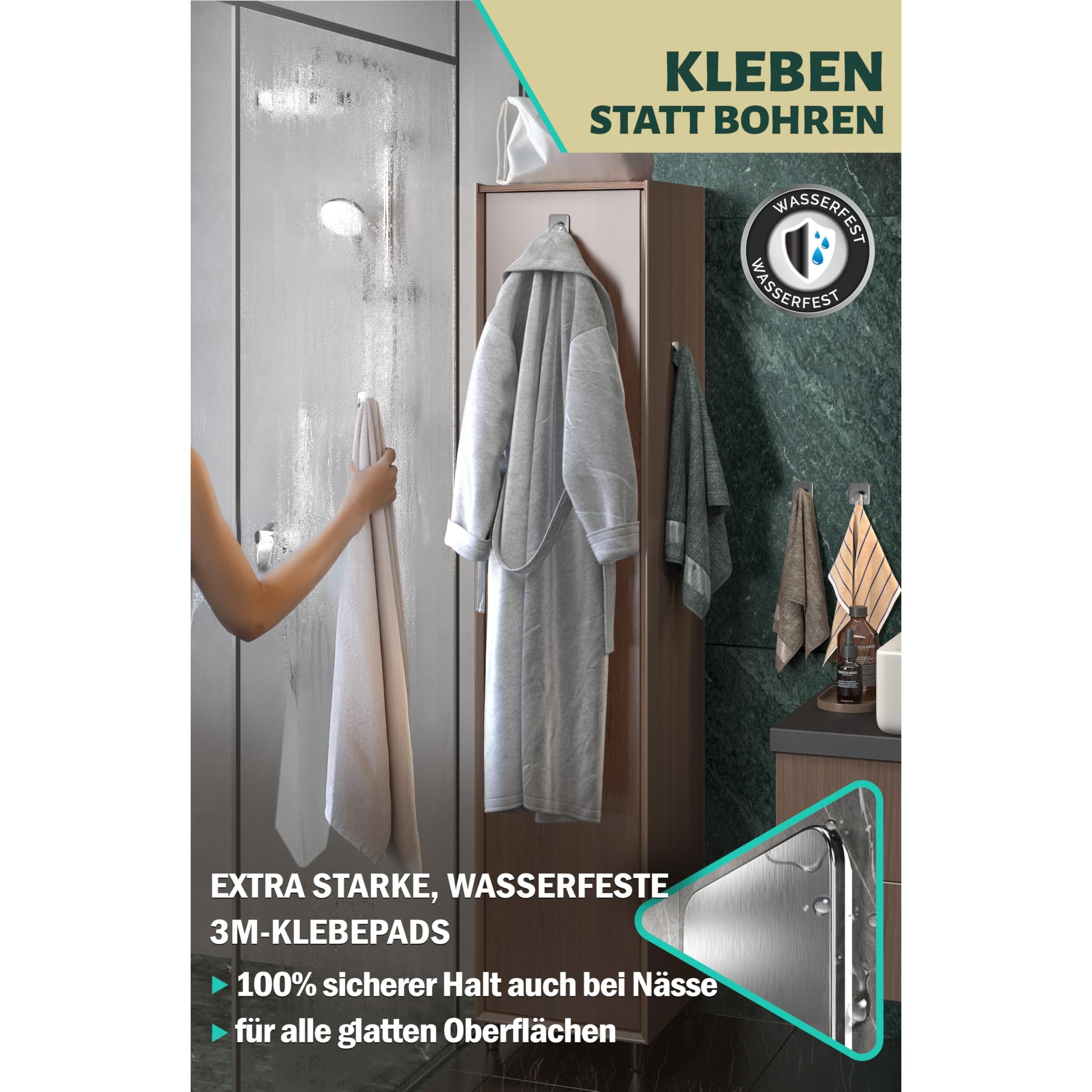 • ÜBERLEGENE MATERIALIEN: Zuverlässige Handtuchhaken selbstklebend aus Edelstahl V2A und hochwertiger Verarbeitung bieten doppelten Rostschutz; einfach zu reinigen; ideal als Badezimmer Zubehör