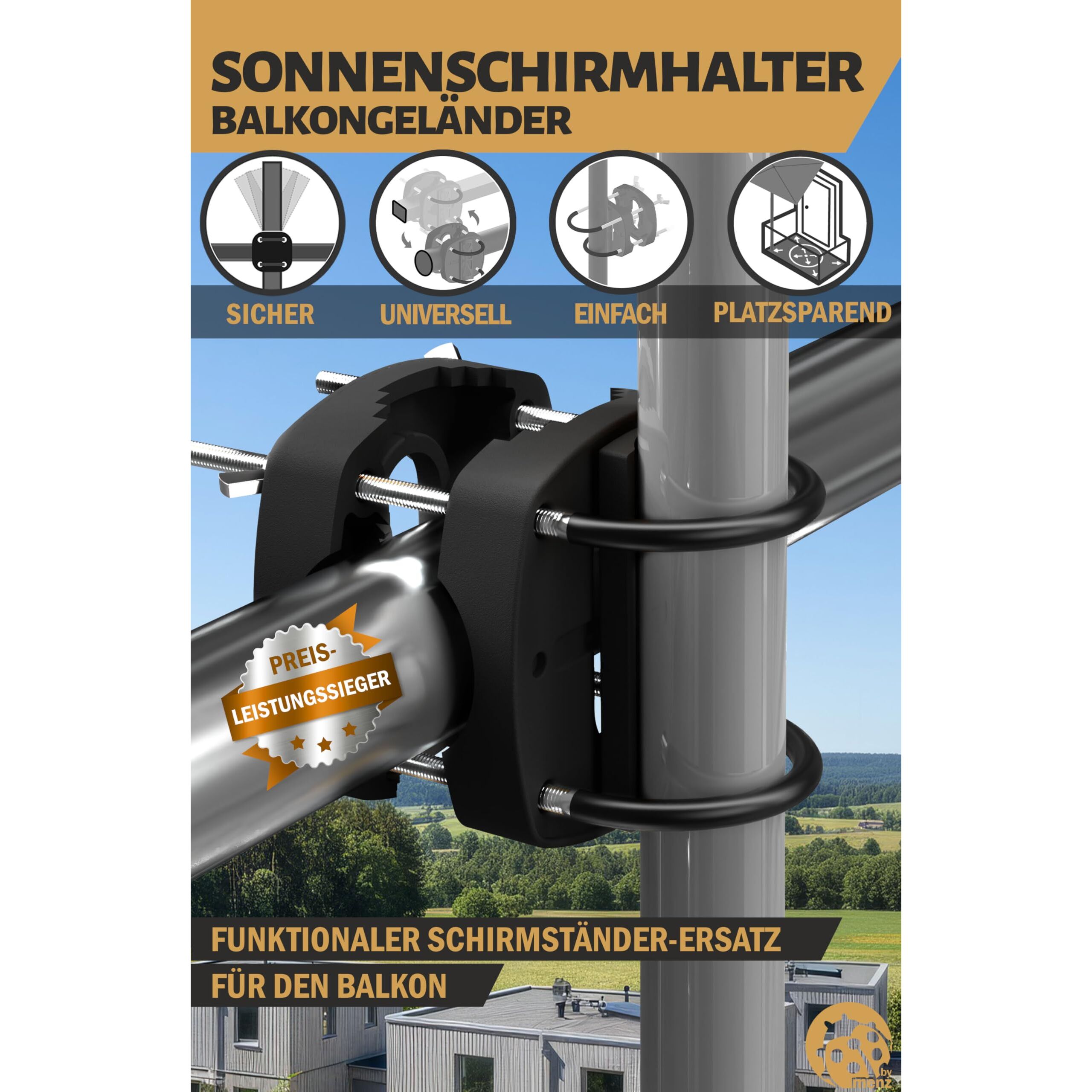 Menz Sonnenschirmhalter Balkongeländer in Schwarz - flexibel montierbare Schirmhalterung Balkongeländer, Solide Schirmhalterung als kompakter Sonnenschirmständer Balkon